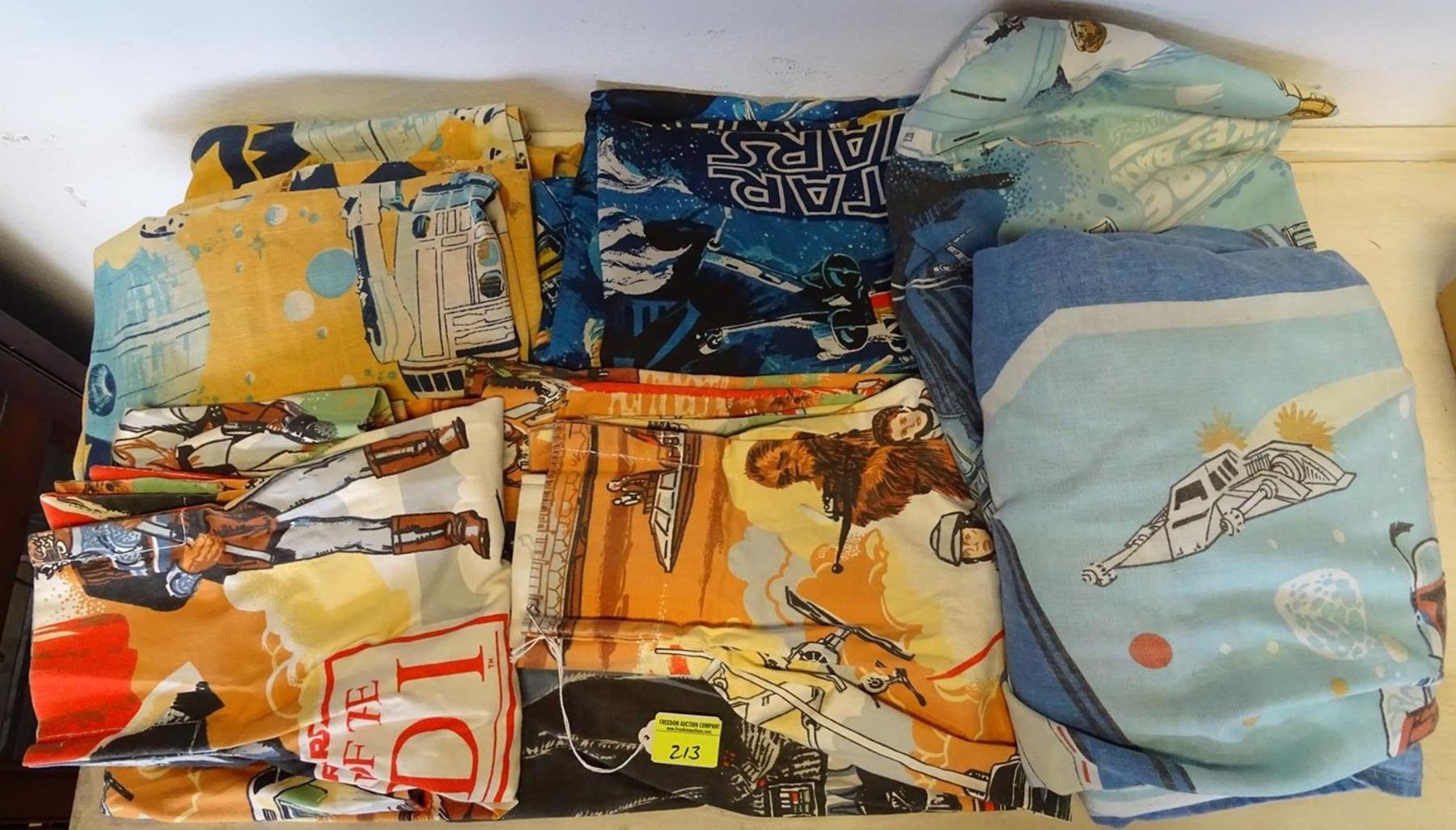 THIS IS A NEAT FIND OF DRAPES AND LINENS ORIGINALLY DISTRIBUTED BY JC PENNEY'S DEPARTMENT STORE. INCLUDES A PAIR OF STAR WARS DRAPES, PAIR OF RETURN OF THE JEDI DRAPES, STAR WARS SINGLE DRAPE AND EMPIRE STRIKES BACK BEDDING LINENS. GOOD OPPORTUNITY FOR RE-PURPOSE OR USE AS IS.