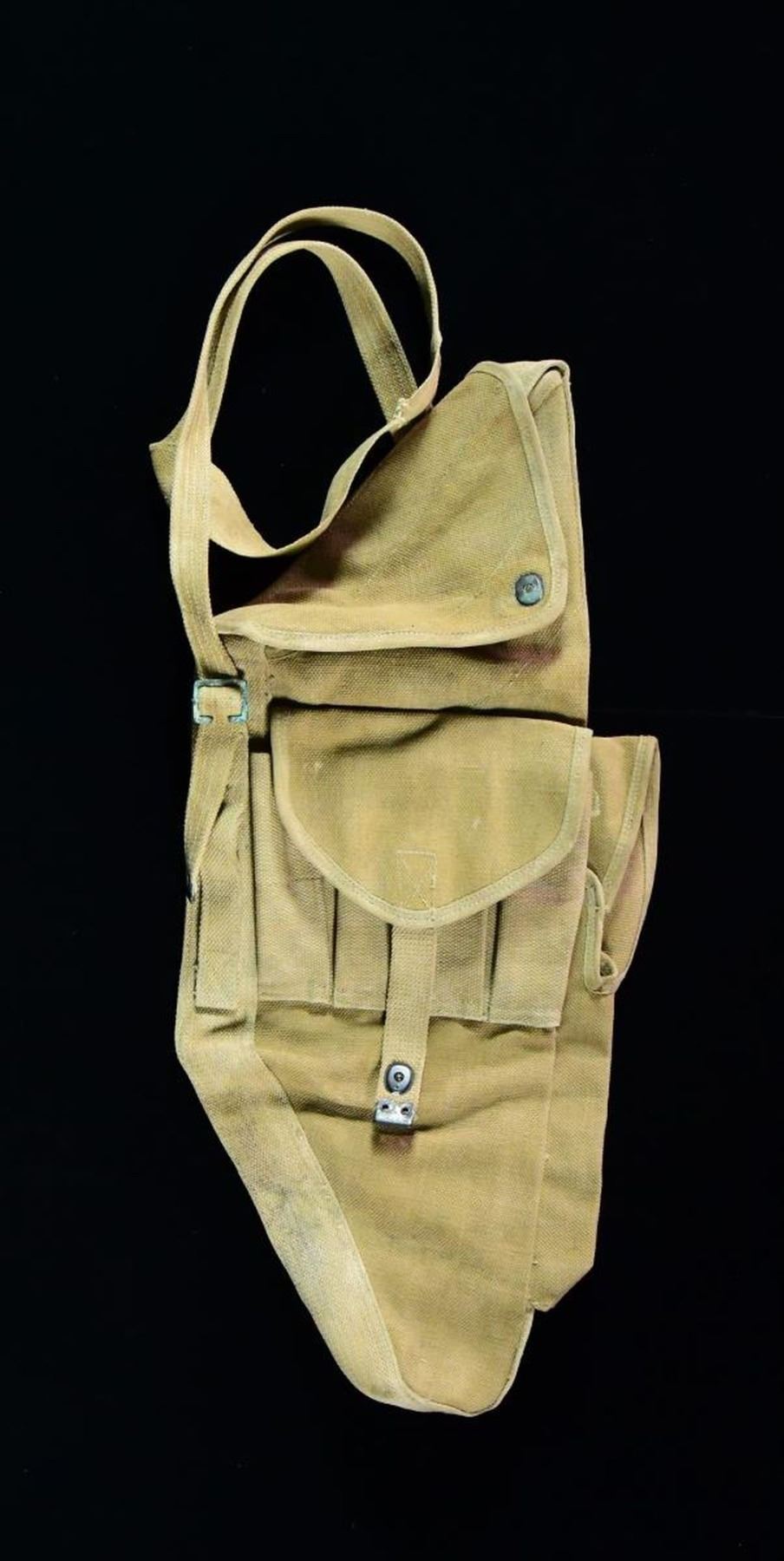 CARRIER. Marine Corps. Case B1 pattern khaki canvas carrier mfg. for use with the Thompson Model 1921/1928 submachine guns. The Case B pattern originated alongside the Model 1921 Thompson, with the only difference as compared to the B1 variation, being an extra 2" in length to be compatible with Thompsons that were equipped with the Cutt's Compensator. Carrier features a 4-cell 20-rd. mag. pouch on the front, with a pocket for the buttstock present on the right hand side. CONDITION: good, with moisture related staining and some spots of darker discoloration, with stitching remaining intact and tight overall. Metal components exhibit corrosion overall. (02-21737/MLW). $400-700.