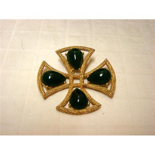 A truly prized piece of workmanship. This gorgeous brooch is gold plated with carvings in the gold. It's shaped in a celtic design and adorned with large green glass cabochons.