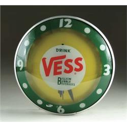 ORIGINAL VESS BEVERAGES BACK-LIT CLOCK. Double-bubble style clock with advertising reverse painted on the outer lens. Manufactured by Advertising Products, Cincinnati, OH, circa 1950’s. SIZE: 15” diam. CONDITION: Very good working condition. 1-3621 (500-600)
