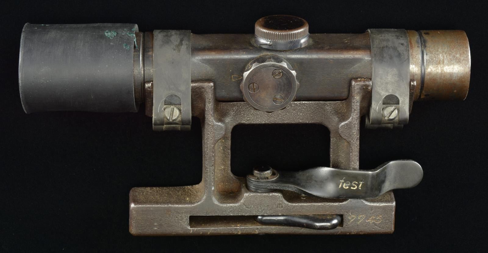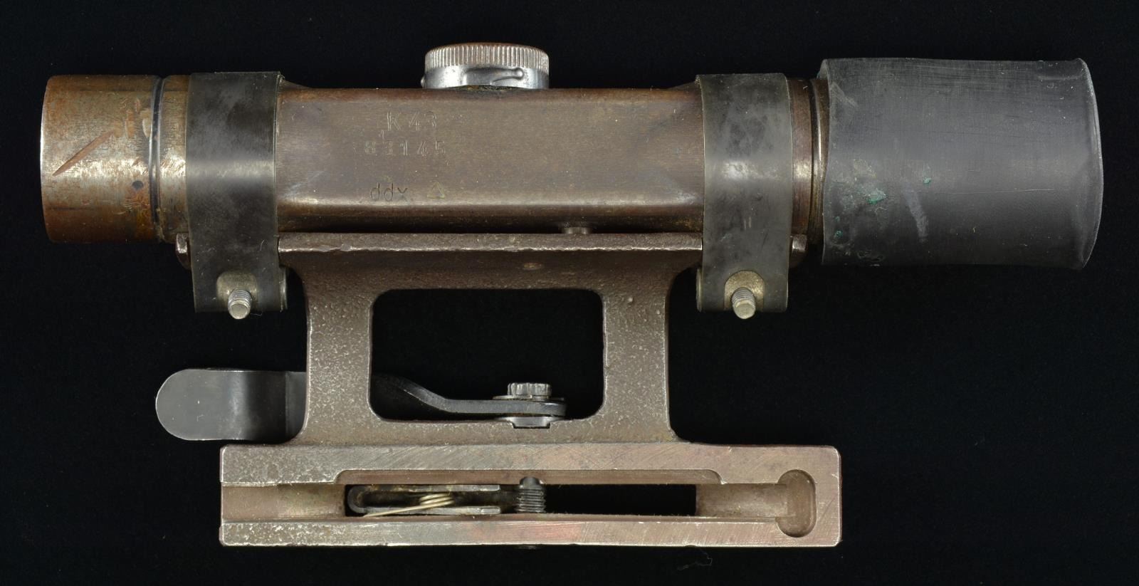 SNIPER SCOPE. S# 83145. Original mount with "(eagle)359" proof & S# 7745 on rail. Post reticle. CONDITION: slightly cloudy optics. Scope body shows scattered handling marks with a few heavier dings & thinning finish showing patina. Waffenampt proofed rubber eye cup. (02-17153/ZAL). $2,000-3,000.