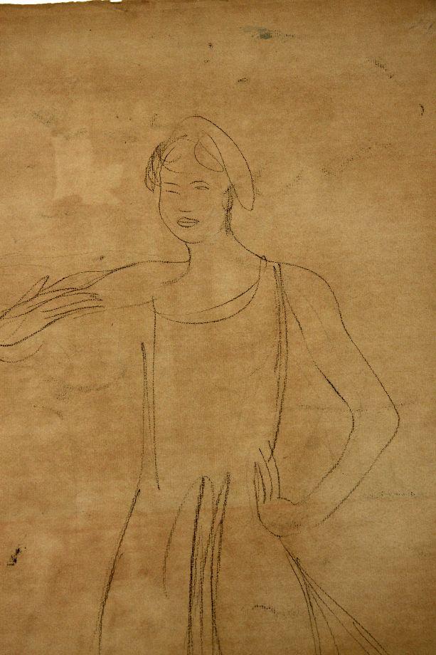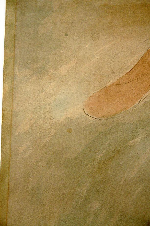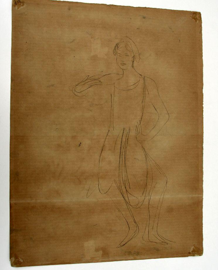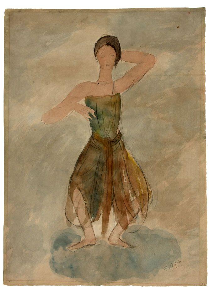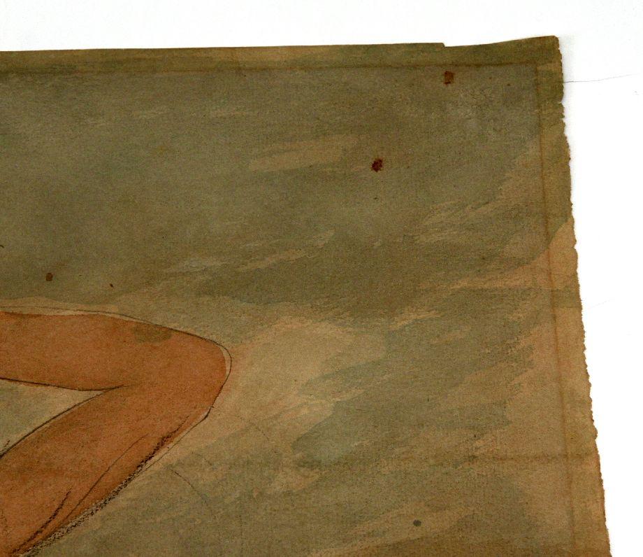 Image size 17x23 inches. Pencil and watercolors on paper by Auguste Rodin (French, 1840-1917) most likely depicting a dancer from the Royal Ballet of Cambodia. Reverse depicts another pencil sketch of a dancer. Signed "A Rodin" in pencil in lower right. Some tape residue at corners.