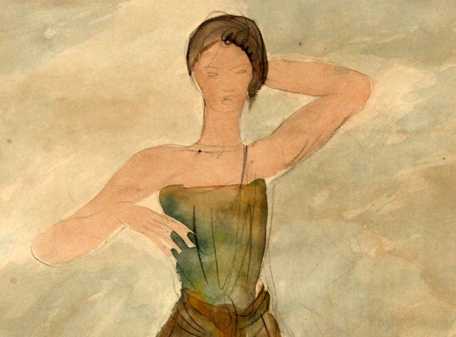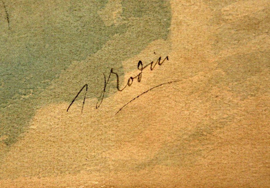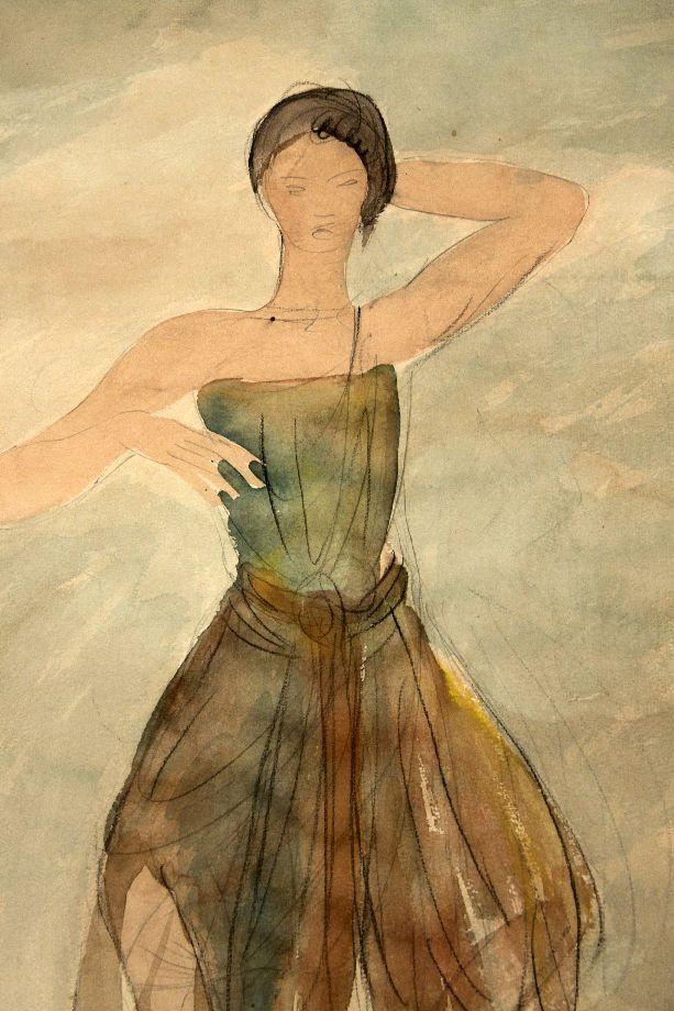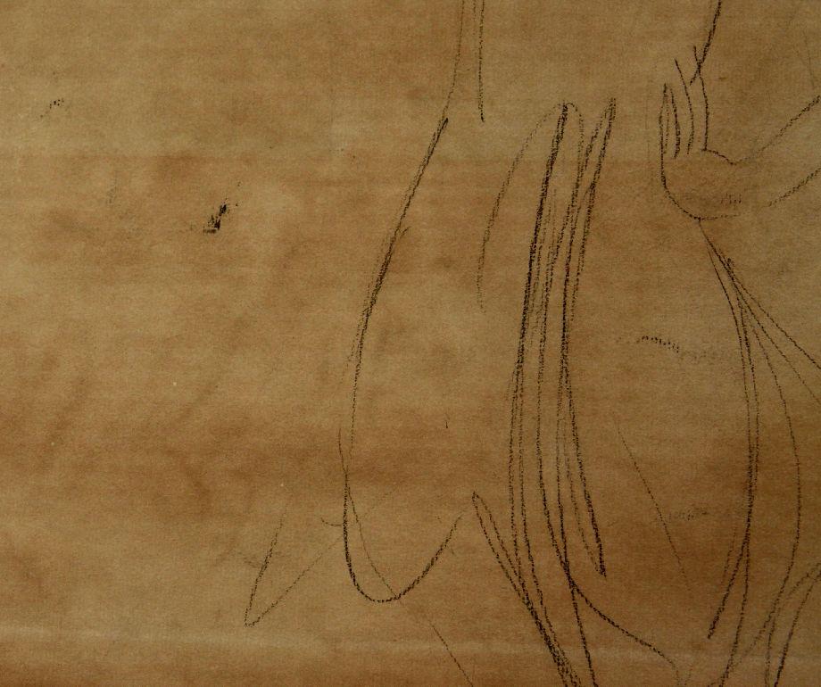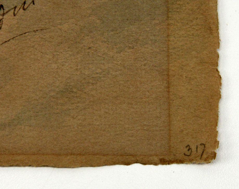 Image size 17x23 inches. Pencil and watercolors on paper by Auguste Rodin (French, 1840-1917) most likely depicting a dancer from the Royal Ballet of Cambodia. Reverse depicts another pencil sketch of a dancer. Signed "A Rodin" in pencil in lower right. Some tape residue at corners.