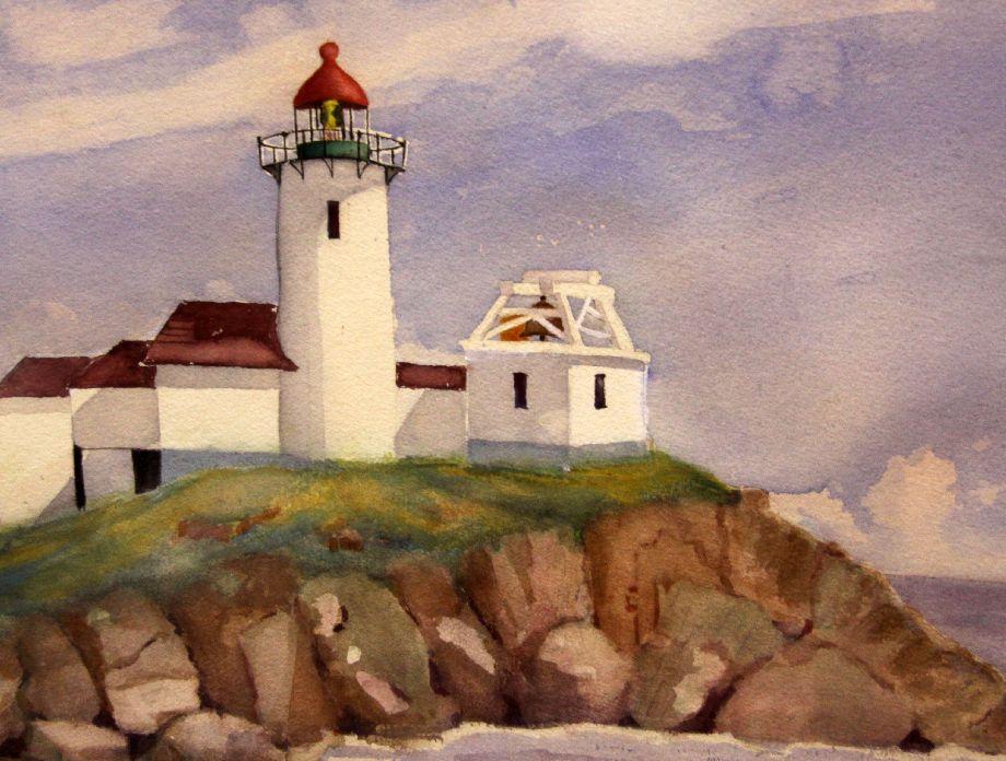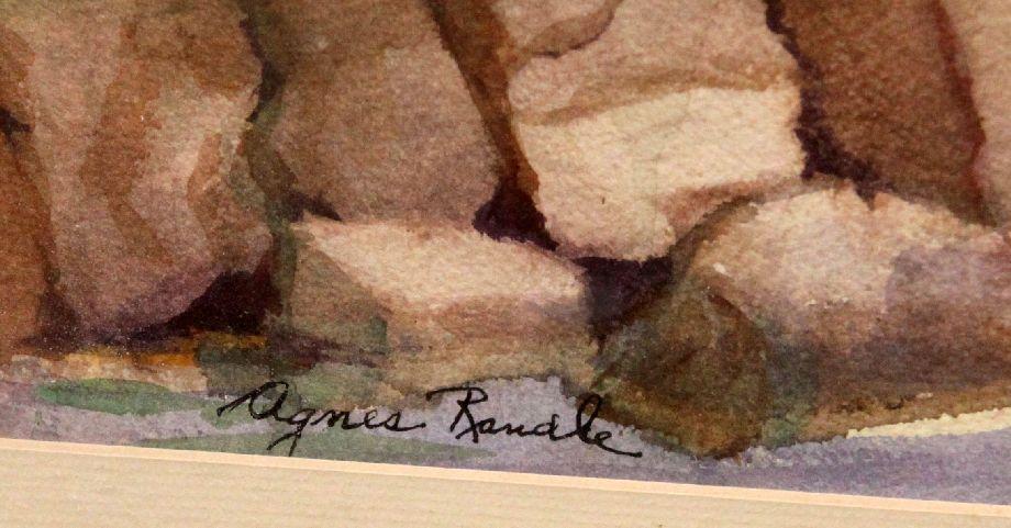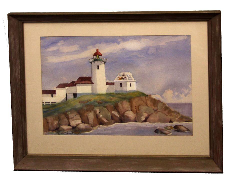 34x29 inches framed. Image size 24.5x20 inches. Original watercolor depicting a lighthouse in a rocky cove. Piece is signed "Agnes Randle" in lower left. Very good condition.