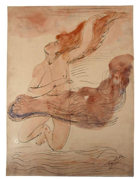Image size 15x19.5 inches. Ink and watercolor on paper by Auguste Rodin (French, 1840-1917). Study of a floating nude with clouds. Ink signed "Aug Rodin" in lower right. Some tape residue to corners.