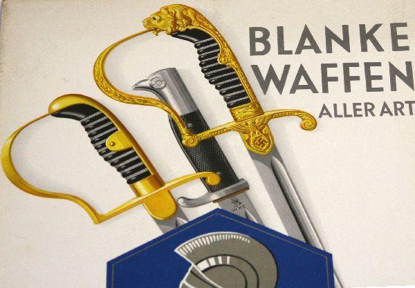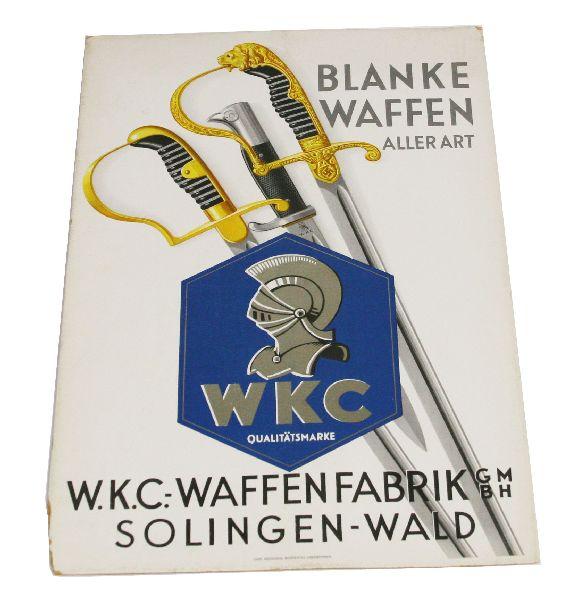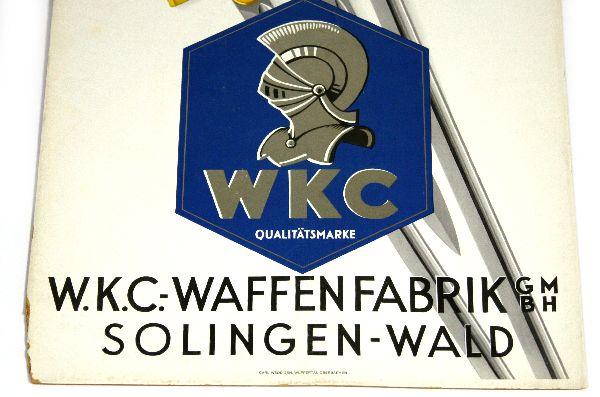 12.5x19 inch cardboard advertising sign for the WKC edged weapons factory in Solingen. German slogan translates to "Bare arms of all kinds", with the factory information below. Overall very good condition with bright colors and some minor losses at the corners.