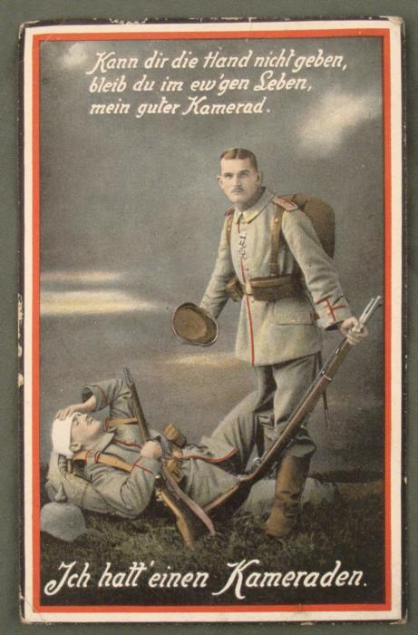 GREAT LOOKING ORIGINAL WWI GERMAN POSTCARD OF A WOUNDED SOLDIER & HIS COMERAD. USED AND POSTMARKED 1917- VG CONDITION - ID'D WITH SENDING WWI SOLDIERS REGIMENT "S B -31ST BAY INF REGMT-3 KOMP"-NICE ORIGINAL GREAT PHOTO. 3 3/8" x 5 3/8".