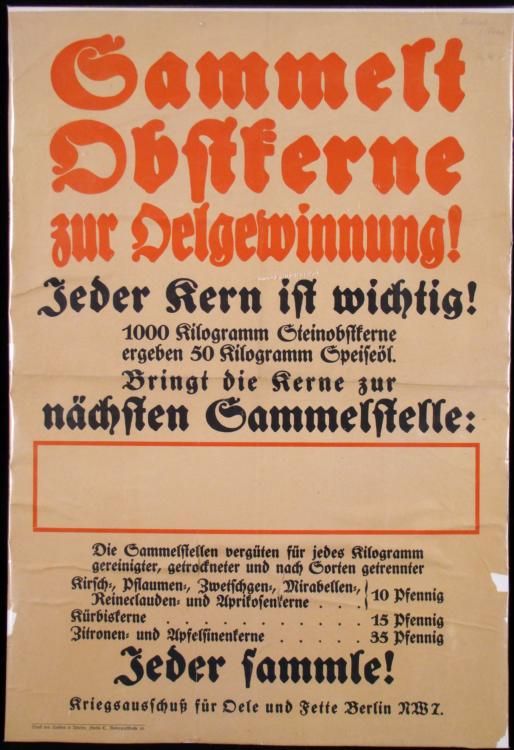 OFFERED HERE IS AN ORIGINAL WWI GERMAN WAR POSTER. THIS WWI GERMAN WAR POSTER IS ASKING PEOPLE TO DONATE SEEDS FROM FRUIT EATEN TO BE GIVEN TO COLLECTION CENTERS TO BE CRUSHED AND USED FOR ARMAMENTS. THE POSTER SHOWS TYPE OF SEEDS NEEDED AND PAYMENTS GIVEN FOR EACH. THE POSTER IS FROM BERLIN AND IS MOUNTED ON POSTER BOARD. ITS DIMENSIONS ARE 17" X 25" AND IT COMES IN A PROTECTIVE SLEEVE. * *