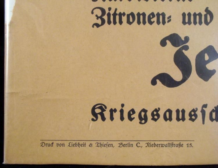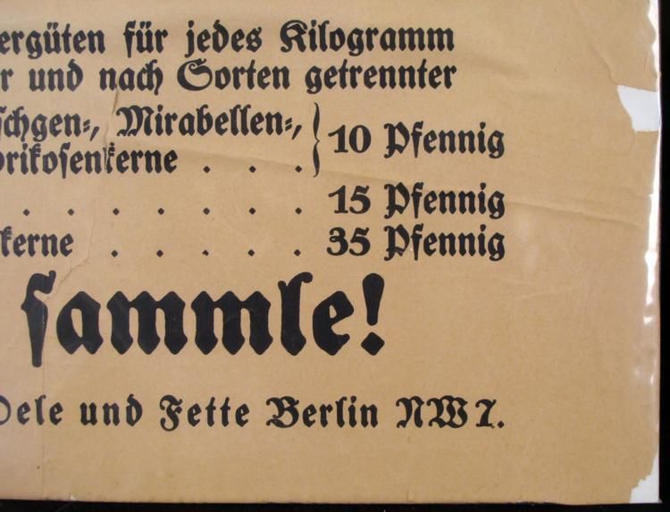 OFFERED HERE IS AN ORIGINAL WWI GERMAN WAR POSTER. THIS WWI GERMAN WAR POSTER IS ASKING PEOPLE TO DONATE SEEDS FROM FRUIT EATEN TO BE GIVEN TO COLLECTION CENTERS TO BE CRUSHED AND USED FOR ARMAMENTS. THE POSTER SHOWS TYPE OF SEEDS NEEDED AND PAYMENTS GIVEN FOR EACH. THE POSTER IS FROM BERLIN AND IS MOUNTED ON POSTER BOARD. ITS DIMENSIONS ARE 17" X 25" AND IT COMES IN A PROTECTIVE SLEEVE. * *