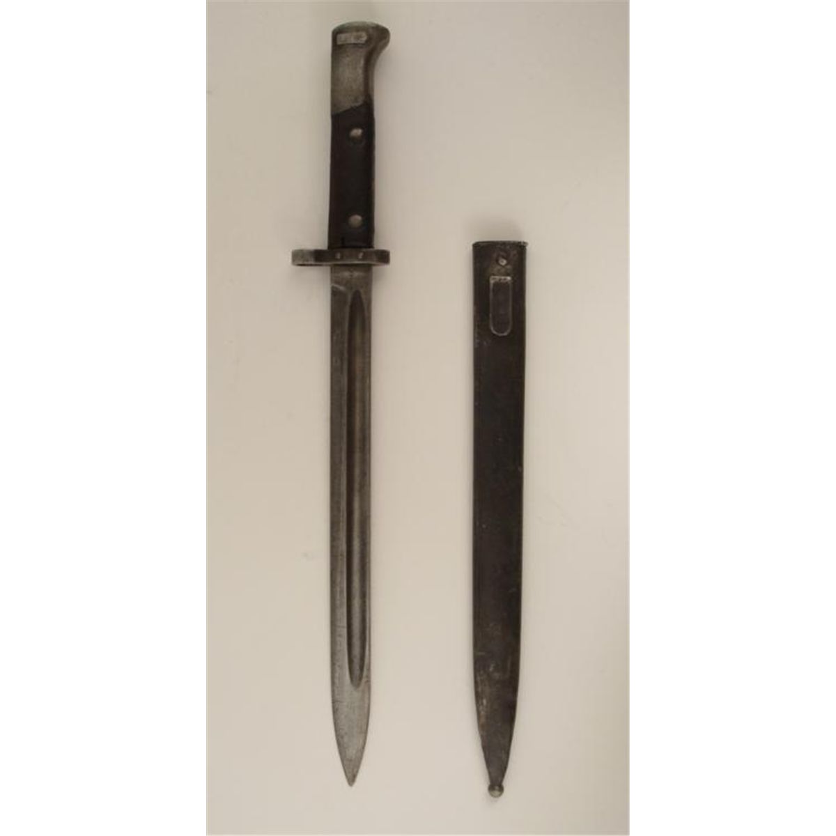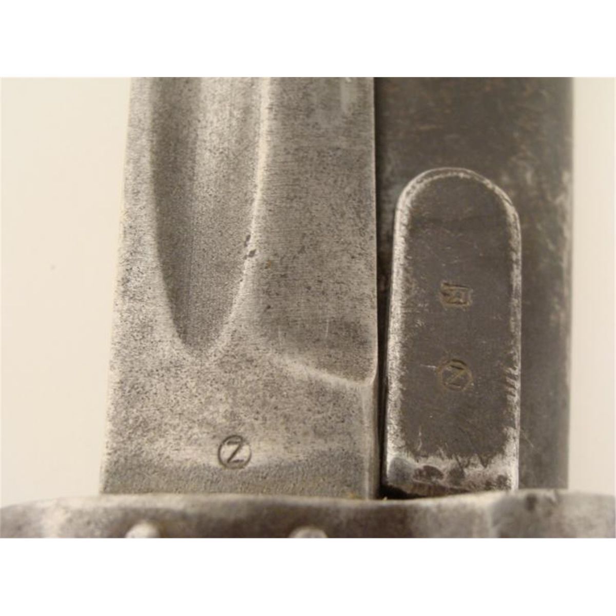 ORIGINAL WWII CZECH MAUSER BAYONET AND SCABBARD. IT IS 11 5/8" LONG WITH A NICE STEEL BLADE. IT IS RICASSO MARKED WITH A "CIRCLE Z". THE BAYONET HAS WOOD GRIPS AND SHOW A COUPLE OF DINGS. THERE IS AN EAGLE HEAD POMMEL WITH THE SERIAL NUMBER ON TOP OF THE POMMEL, "12207". THE RELEASE BUTTON WORKS FINE. IT HAS A DARK METAL SCABBARD, ALSO WITH A MARKING ON THE FROG NUB. *