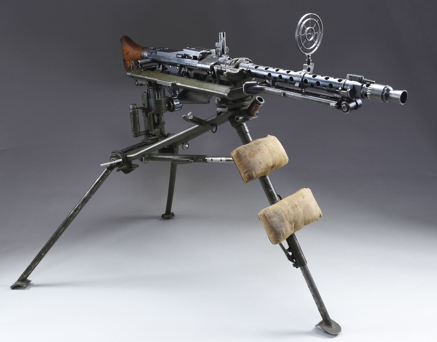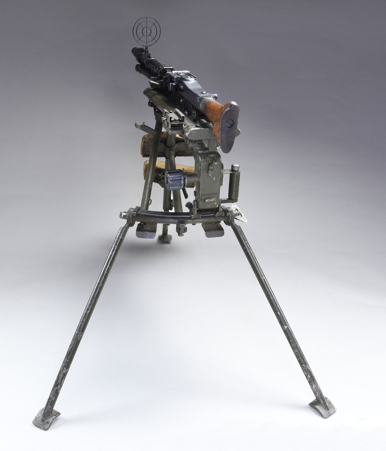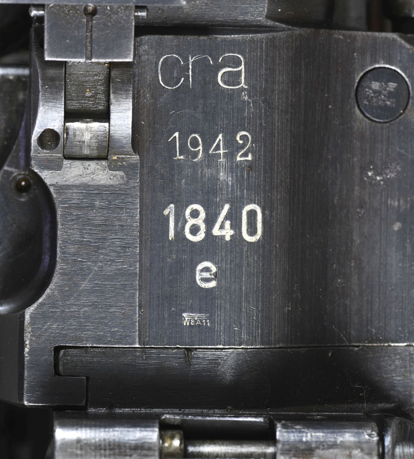 GUN. PRE 86 DEALER SAMPLE (KEEPER). Cal. 8mm. S# 1840E. Bbl. 24". 1942 dated "cra" marked German MG34. The MG34 is one of the most recognizable of the German WWII era MG's. Designed by Mauser on order of the Waffenamt, it was manufactured in the early days where German tolerances & quality were front & center, over the later guns all nations involved would be forced to manufacture which placed the focus on quick & inexpensive. The MG34 can easily be described as functional artwork. 109 Different parts were manufactured from bar stock, obviously before the pressed & stamped manufacturing processes would eventually take over. Before WWII was over, almost 500,000 MG34's were produced by 5 different firms. The trigger mechanism of the MG34, though complicated in design, was extremely simple for the operator since no external selector was necessary to switch between semiautomatic & fully automatic fire. The elongated trigger could simply be depressed at the top for semiautomatic & squeezed at the bottom for full automatic fire. With an overall length of almost 48" & a sight radius of 21", neither accuracy nor the ability to lay down an enormous amount of lead would pose to be a problem. Front sight is a folding blade, rear sight is a graduated notch from 200 to 2000 meters. Visible Waffenamt markings in several locations. Heavily knurled cocking handle. Ventilated barrel shroud with AA sight base doubling as front sling swivel, currently sporting AA "spider web" front sight. Integral folding bipod locks correctly in retracted position. Correct barrel booster locks into position with a spring loaded mechanism built into the front sight mount. Matching numbers "1840e" on several visible parts such as receiver, stock & barrel jacket. Several German Party symbols scattered throughout as typical of period German manufacture. Lafette tripod is painted dark green and appears to be functional in all aspects. Trigger mechanism is smooth, as is the traverse & elevation mechanism. This tripod still retains the frnt pads & coverings. UNATTACHED ACCESSORIES: Lafette Tripod, 5 lengths of non-desintegrating belt links. CONDITION: finish on all external metal parts is a little nicer than par with the majority of these era guns. Coverage is complete with some signs of handling and use as expected. Several of the parts are original German arsenal replacements, bearing several different numbers. Numerous Waffenamts and factory codes, in several locations. Hardwood stock presents as usual, w/ scattered light impressions and a small crack on left side running rearward from the steel collar, however it doesn't appear to have any structural significance. Black pistol grips are in nice condition demonstrating some impressions & a few light chips under close inspection. The fire control mechanism appears to function correctly when cycled by hand. Bright shiny bore w/ strong rifling. NATIONAL FIREARMS ACT MG REQUIRING BATF TRANSFER BEFORE TAKING POSSESSION. PRE-86 DEALER SAMPLE (KEEPER). MUST BE AN FFL W/ SOT IN ORDER TO TAKE POSESSION. PROVENANCE: From the Lifelong Collection of Brian Linde. (03-1840/JZ). CLASS III. $8,000-14,000.