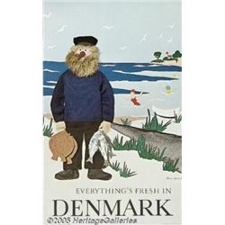 <B>Denmark (Permild and Rosengreen, 1973)</B></I> Travel Poster (24.5" X 41"). Collage of fisherman, swimmers and house. Poster, in a typical 1970s style, uses a humorous, almost cartoonish illustration to promote travel to Denmark. Artist Kiersten Agerstil. Very Fine- condition.