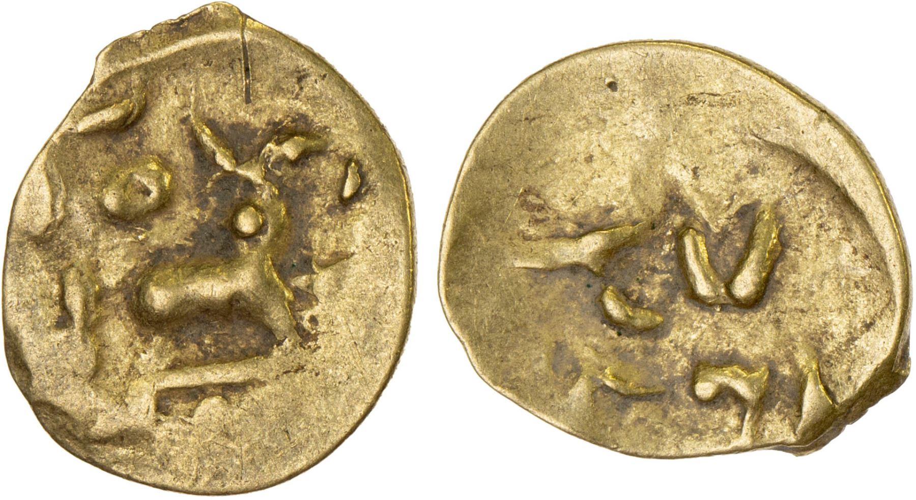 ORISSA: Anonymous, 12th/13th century, AV fanam (0.43g), year 13, Tripathy-1, sa + date // couchant bull, circle & 2 crescents above, goad behind, circle & 3 dots before, VF-XF, R. Odisha, formerly Orissa, is a state located in Eastern India. The ancient kingdom of Kalinga, which was invaded by the Mauryan Emperor Ashoka in 261 BCE resulting in the Kalinga War, coincides with the borders of modern-day Odisha. The Somavamshi (or Keshari) dynasty ruled parts of present-day Odisha in eastern India between the 9th and the 12th centuries. Their capitals included Yayatinagara (modern Binka) and Abhinava-Yayatinagara (modern Jajpur).