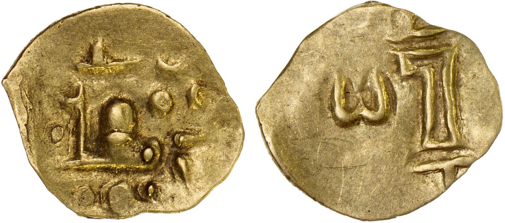 ORISSA: Anonymous, 12th/13th century, AV fanam (0.43g), year 2, Tripathy-1, sa + date // couchant bull, circle & 2 crescents above, goad behind, circle & 2 dots before, nice VF, R. Odisha, formerly Orissa, is a state located in Eastern India. The ancient kingdom of Kalinga, which was invaded by the Mauryan Emperor Ashoka in 261 BCE resulting in the Kalinga War, coincides with the borders of modern-day Odisha. The Somavamshi (or Keshari) dynasty ruled parts of present-day Odisha in eastern India between the 9th and the 12th centuries. Their capitals included Yayatinagara (modern Binka) and Abhinava-Yayatinagara (modern Jajpur).