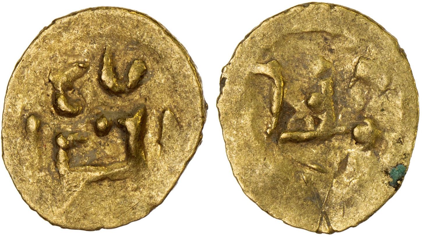 ORISSA: Anonymous, 12th/13th century, AV fanam (0.45g), year 12, Tripathy-1, sa + date // couchant bull, circle & 2 crescents above, goad behind, circle & 3 dots before, VF-XF, R. Odisha, formerly Orissa, is a state located in Eastern India. The ancient kingdom of Kalinga, which was invaded by the Mauryan Emperor Ashoka in 261 BCE resulting in the Kalinga War, coincides with the borders of modern-day Odisha. The Somavamshi (or Keshari) dynasty ruled parts of present-day Odisha in eastern India between the 9th and the 12th centuries. Their capitals included Yayatinagara (modern Binka) and Abhinava-Yayatinagara (modern Jajpur).