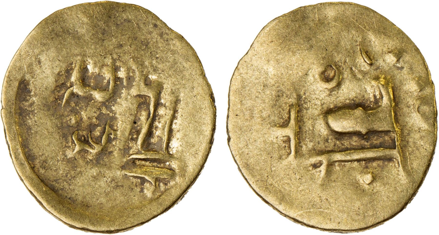 ORISSA: Anonymous, 12th/13th century, AV fanam (0.46g), year 32, Tripathy-1, sa + date // couchant bull, circle & 2 crescents above, goad behind, circle & dots before, VF-XF, R. Odisha, formerly Orissa, is a state located in Eastern India. The ancient kingdom of Kalinga, which was invaded by the Mauryan Emperor Ashoka in 261 BCE resulting in the Kalinga War, coincides with the borders of modern-day Odisha. The Somavamshi (or Keshari) dynasty ruled parts of present-day Odisha in eastern India between the 9th and the 12th centuries. Their capitals included Yayatinagara (modern Binka) and Abhinava-Yayatinagara (modern Jajpur).