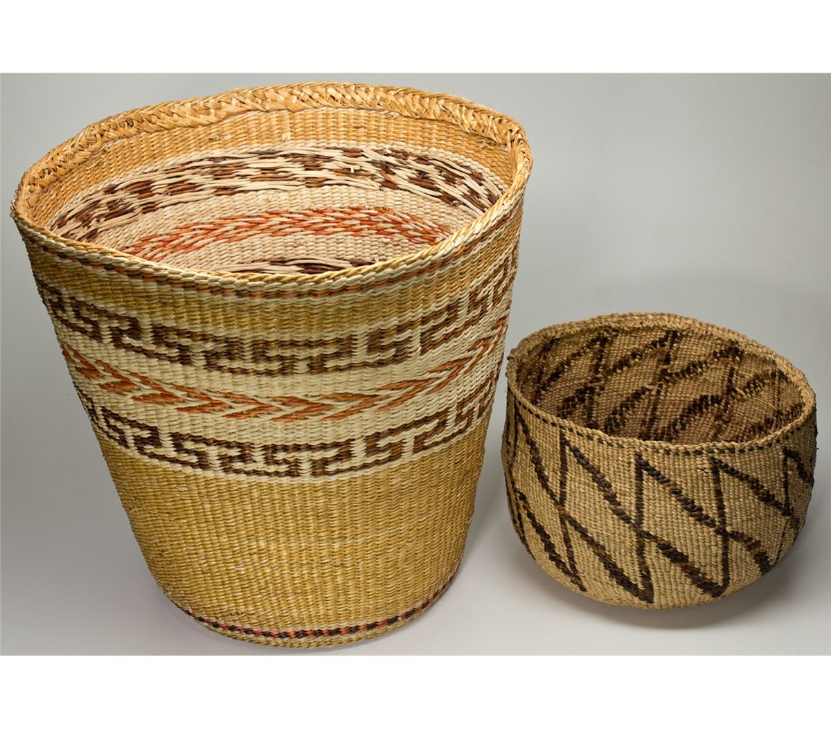 This is a lot of two Klamath Indian baskets. The large bucket style basket is 9" high, with a 6" base and a 10" opening. The bowl style is 4" high and 6" wide at the mouth and is decorated with a leaning diamond design. Both baskets are made from tule material and appear to be invery good condition.