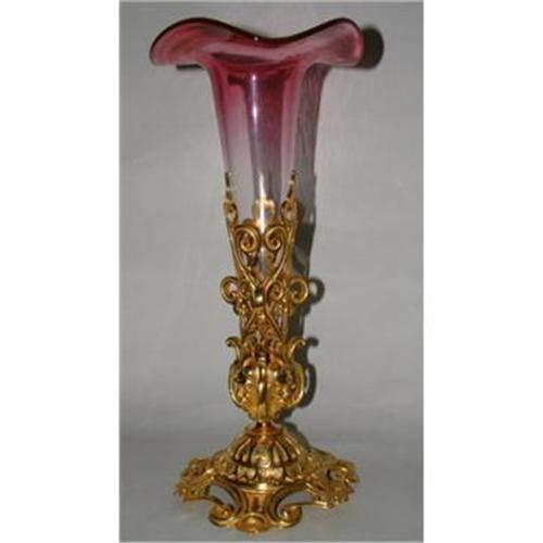 An Extremely Impressive Well Cast Ormolu Centerpiece or Epergne of impressive size, complete with original Cranberry glass flute with flared rim, raised on a lavish cast base with pierced decoration, possibly French or English. Late 19th, early 20th Century. <p> NOTE: This piece is reasonably heavy.