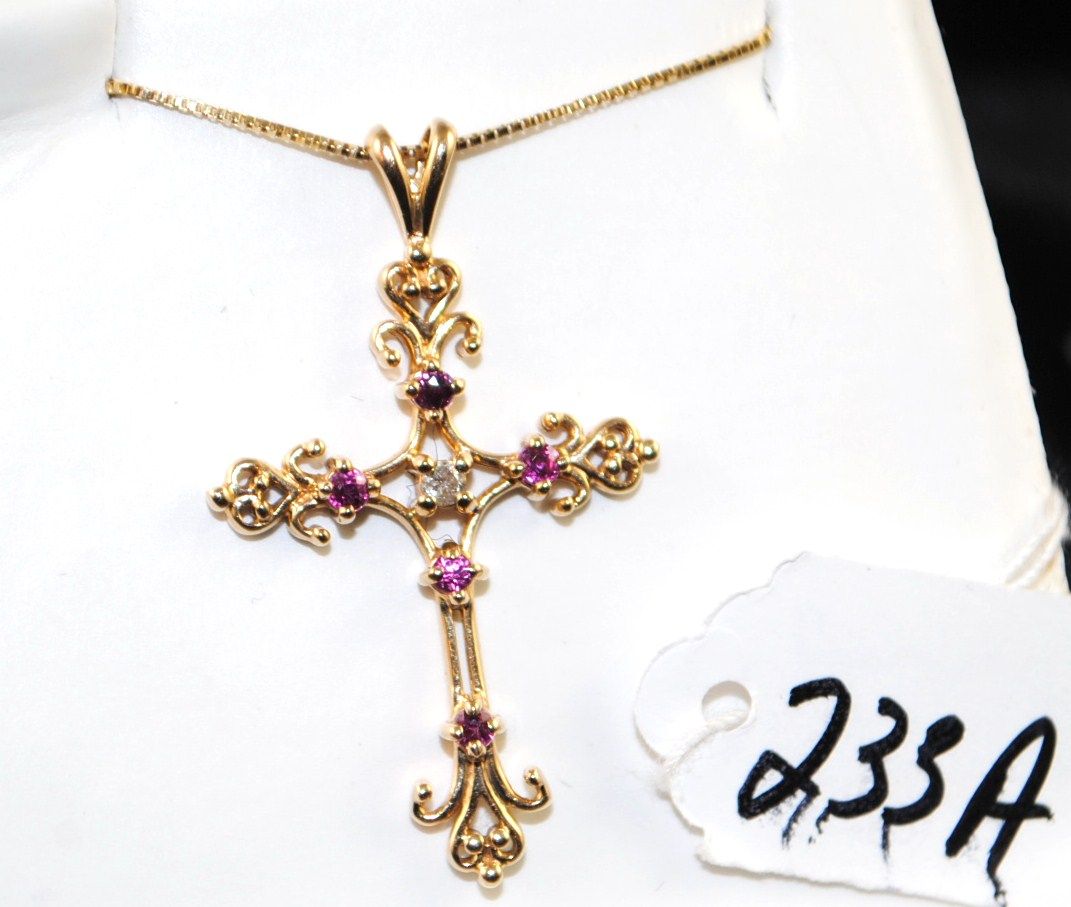 ORNATE 14K YELLOW GOLD RUBY AND DIAMOND CROSS AND CHAIN - APPRAISED RETAIL REPLACEMENT IS $1,925.00 -COMES WITH THE JEWELERS APPRAISAL CARD FOR INSURANCE