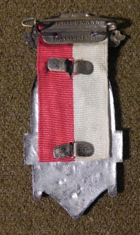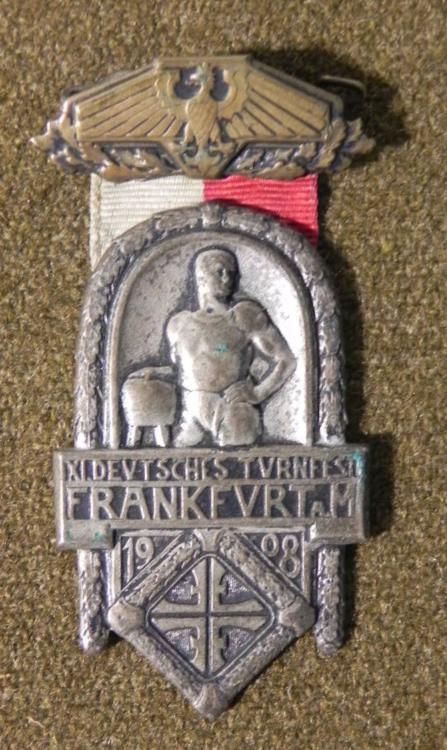 OFFERED HERE IS AN ORNATE 1908 IMPERIAL GERMAN-XI DEUTSCHES TURNFEST-FRANKFURT. THIS BEAUTIFUL 1908 AWARD WAS FOR A SPORTS FESTIVAL IN FRANKFURT WITH THE IMPERIAL EAGLE ON TOP. IT HAS A RED & WHITE RIBBON WITH A SUSPENDED US ATHLETE.