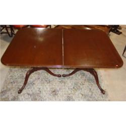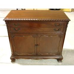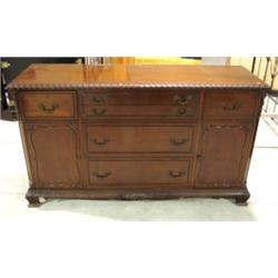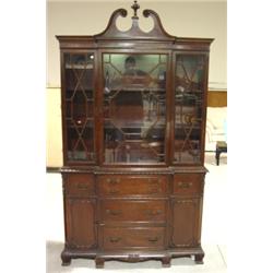 Ornate 9 piece mahogany diningroom suite consisting of pedestal base dining table with leaf, 3 door glass top china closet, sideboard, 2 drawer over 2 door server, 5 matching chairs (4 side & 1 arm). Overall condition is good. Slight wear to feet of all pieces. Bottom slat on one side chair is damaged. Table includes padding. Table: 29.5" H, 64.5" x 42" (w/out 12" W leaf); china closet: 84" H, 45" W, 13.5" D; sideboard: 35.5" H, 61" W, 20.5" D; server: 33.5" H, 37" W, 18" D.