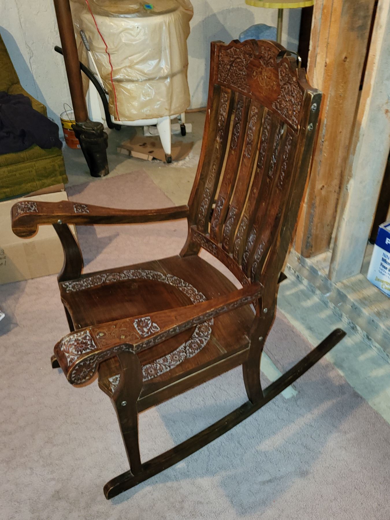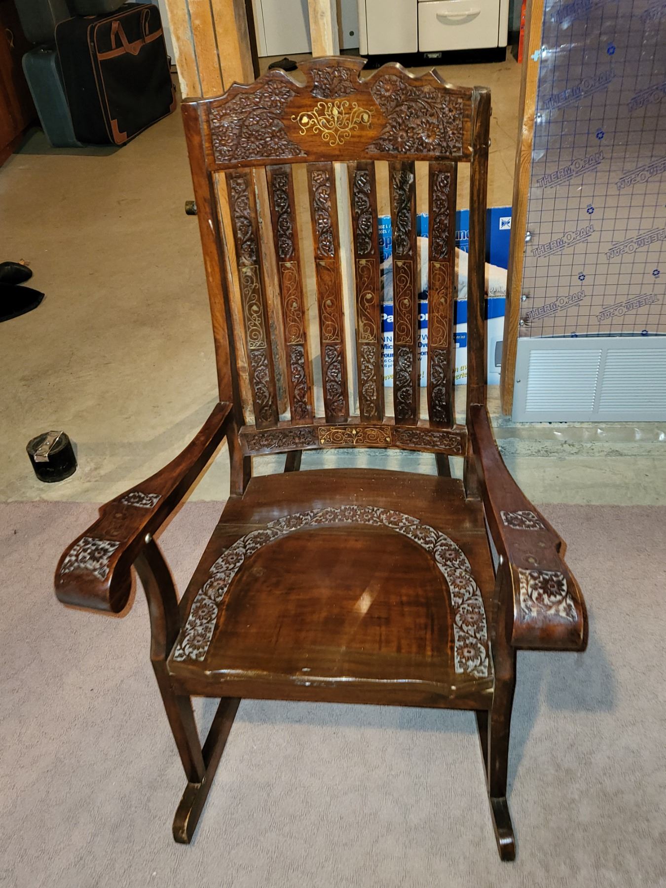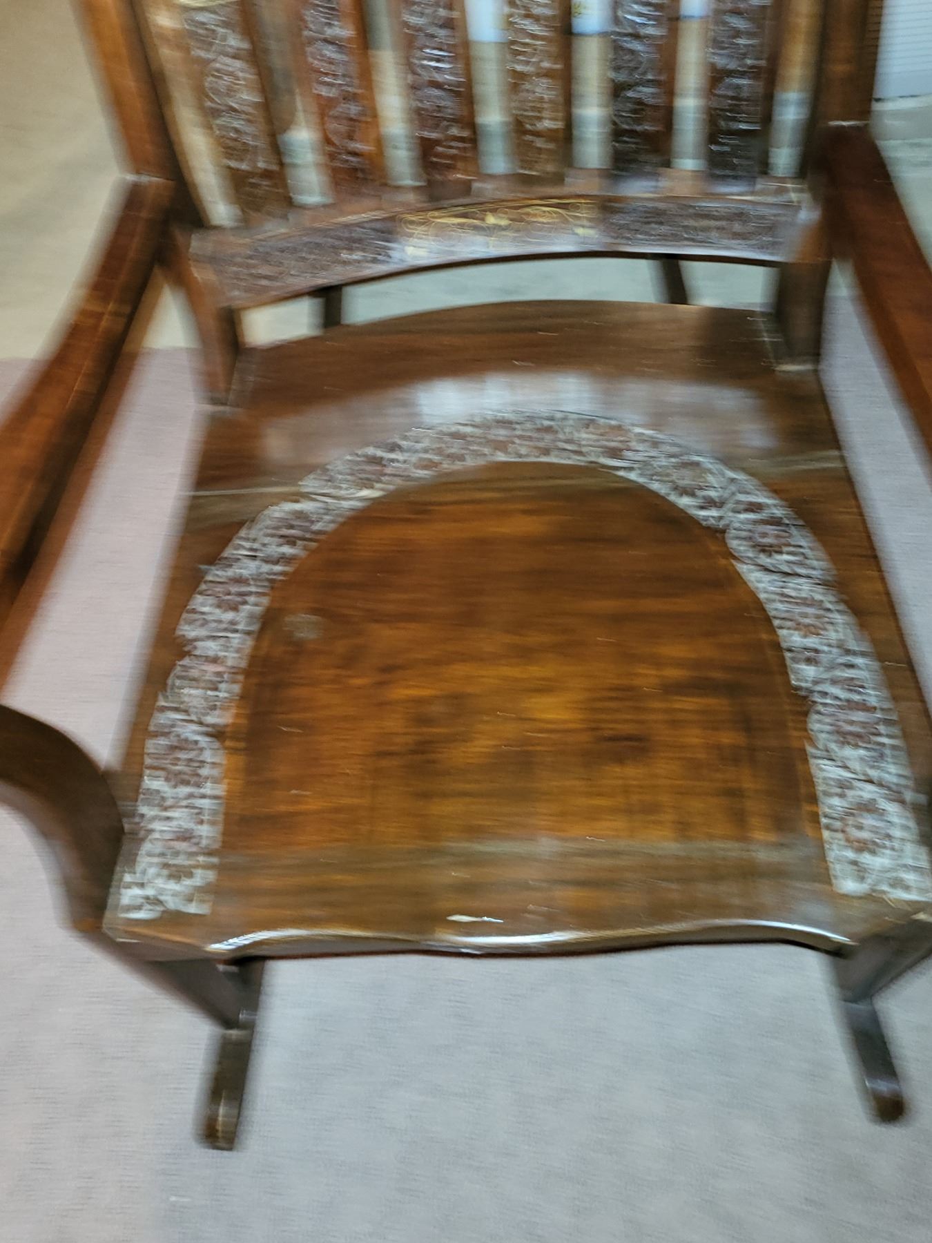 ORNATE ANTIQUE DARK WOOD ROCKING CHAIR WITH INLAY. MEASURES 22.25" X 37" X 43". VERY STURDY AND PROBLEM FREE