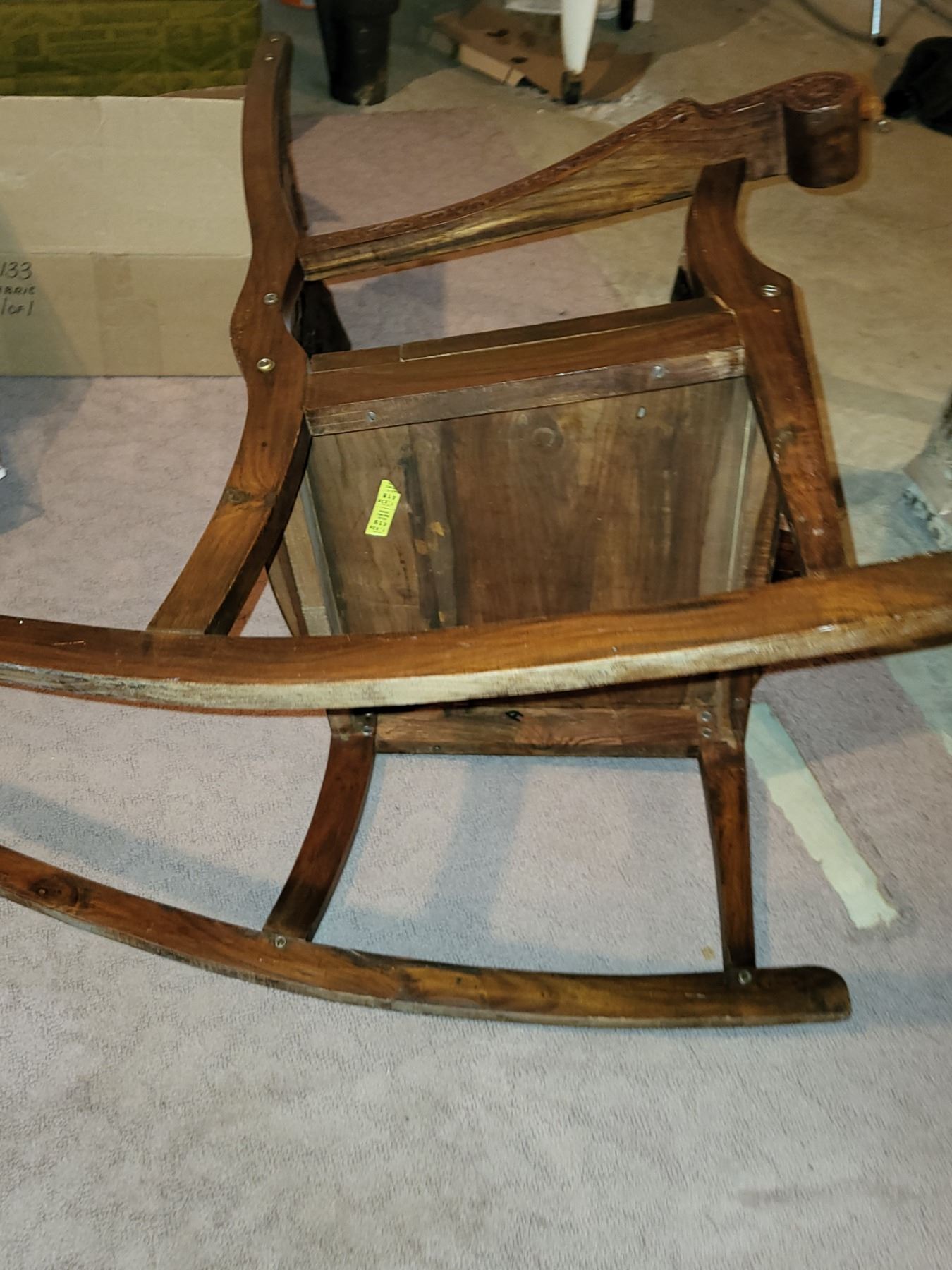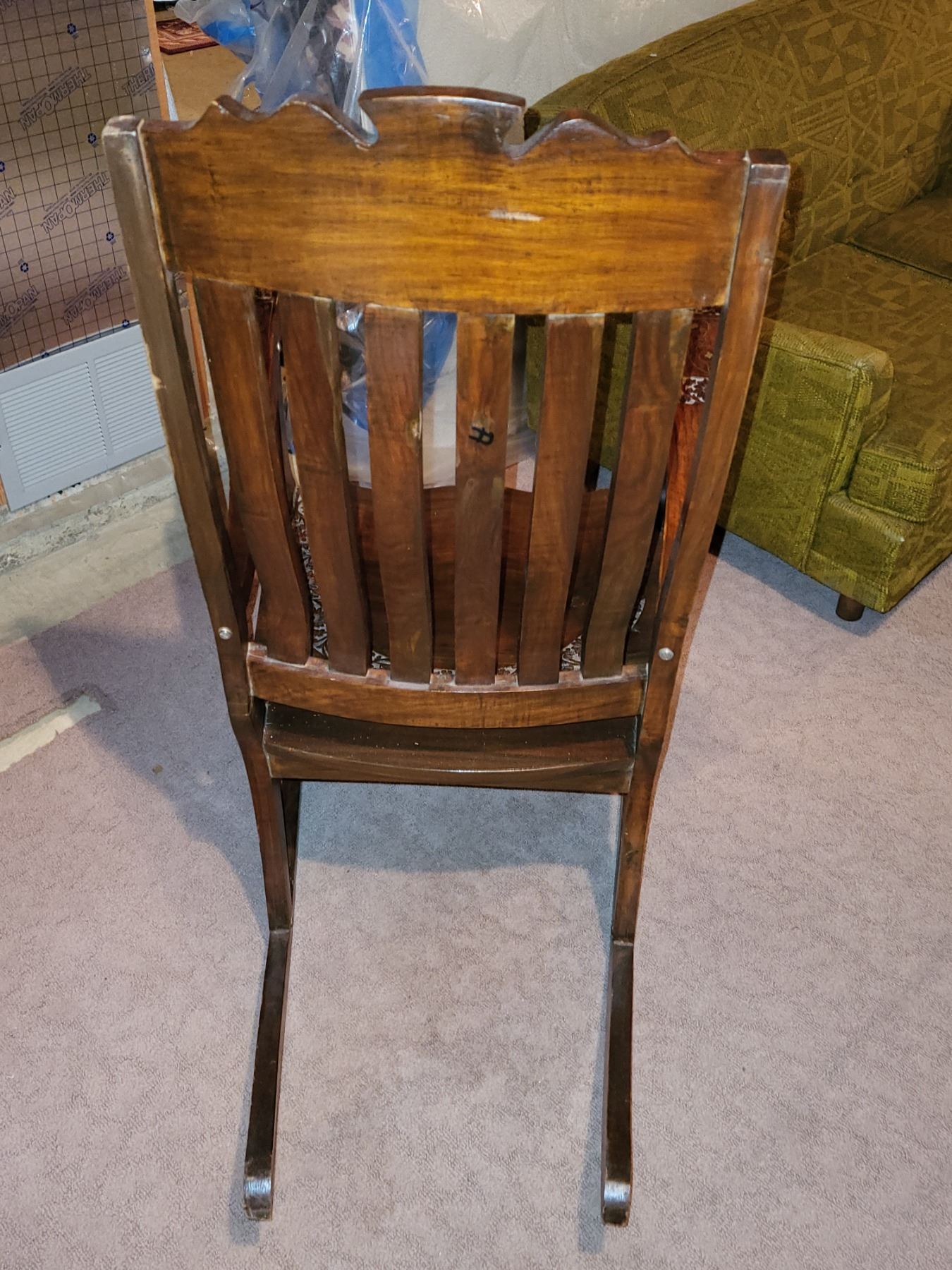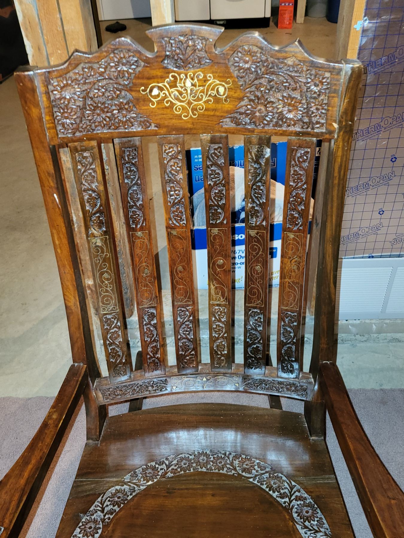 ORNATE ANTIQUE DARK WOOD ROCKING CHAIR WITH INLAY. MEASURES 22.25" X 37" X 43". VERY STURDY AND PROBLEM FREE