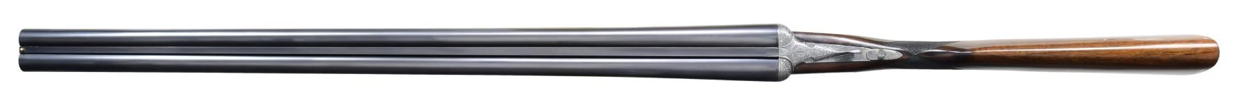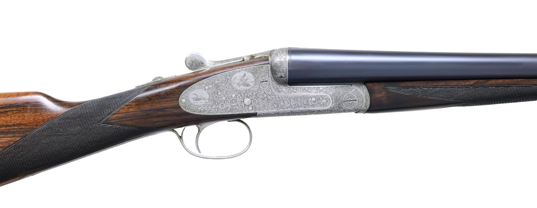 SHOTGUN. Cal. 12ga 2 3/4". S# 57-03-475-00. Bbls are 28" with concave rib and brass bead. Choke markings are CYL and MOD. Rounded body, self opening sidelock action. Features include single non-selective trigger, selective ejectors & cocking indicators. Action has spectacular full coverage engraving. Right lockplate features two circular scenes with flying mallards. Left lockplate circular scenes features flying pheasants. Floorplate scene depicts a woodcock. Balance of action is completely covered with fine arabesque scroll having vine type floral highlights and ribbon style banners. Trigger guard bow has gold monogram "MM". Steel tipped splinter forearm and straight hand stock of fancy European walnut having light and dark reddish tones with vivid dark streaking. Forearm and stock have point pattern wrap around hand checkering. LOP: 14 1/2" to a checkered butt. DAC: 1 1/2". DAH: 2". Neutral cast. WEIGHT: 6lb 13.6 oz. Bore diameter: RT: .727; LT: .727. Choke constriction RT: cylinder bore; LT: .028 Minimum wall thickness: RT: .031; LT: .031. Bespoke custom gun, right bbl has original owner's name "Michel Merle". S# indicates manufacture in 2000. UNATTACHED ACCESSORIES: leather covered luggage case with purple felt fitted interior having maker's label on inside of lid. CONDITION: bbls retain over 95% blued finish. Action has very good satin gray finish showing small spots of stock finish overspray. Stocks have an added coat of finish over small handling marks and retain very good checkering. Action is tight and on face. Very good bright bores. (25-935/DS). MODERN. $3,500-6,000.