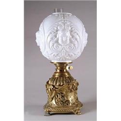 Lot 43B. ORNATE BRASS KEROSENE LAMP Rare kerosene lamp has very ornate cast brass body with open work panels featuring cupids among floral sprays. Brass feet alternate between a stylized shell design and a classic scroll design and give way to a high relief scroll and leaf design running up the body of the lamp. Top of cast body is highlighted with lion's heads and high relief shields. Brass font has vertical ribbed design on shoulder and gives way to a duplex burner. Wick knobs are marked "Duplex PA". Lamp is finished with a white milk glass ball shade with high relief children's faces within a swirling leaf design. SIZE: 20" t to top of shade. CONDITION: One burner attachment lip is missing and a few very minor chips to top and bottom rim of shade, otherwise very good. 5-71040