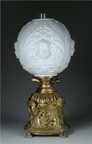 ORNATE BRASS KEROSENE LAMP. Rare kerosene lamp has very ornate cast brass body with open work panels featuring cupids among floral sprays. Brass feet alternate between a stylized shell design and a classic scroll design and give way to a high relief scroll and leaf design running up the body of the lamp. Top of cast body is highlighted with lion's heads and high relief shields. Brass font has vertical ribbed design on shoulder and gives way to a duplex burner. Wick knobs are marked "Duplex PA". Lamp is finished with a white milk glass ball shade with high relief children's faces within a swirling leaf design. SIZE: 20 in. t to top of shade. CONDITION: One burner attachment lip is missing and a few very minor chips to top and bottom rim of shade, otherwise very good. 5-71040