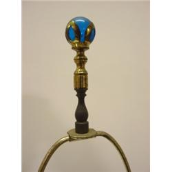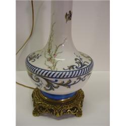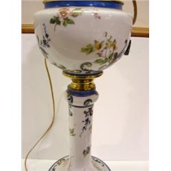 Ornate china stemmed floral decorated table lamp. Brass base and font. Has been electrified with hole drilled through bottom of burner. 43.25" H