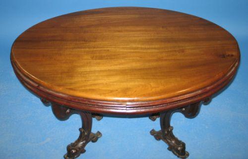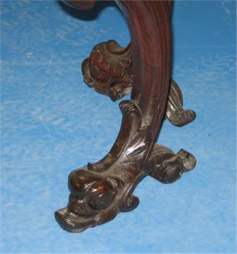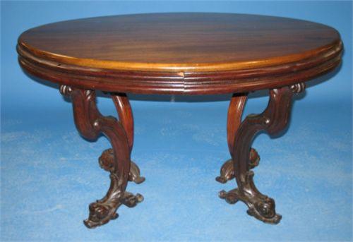 ORNATE WALNUT COFFEE TABLE. Has mahogany base with carved figural dolphin fish feet. Oval walnut top. 24” H, 40.25” L, 27” W