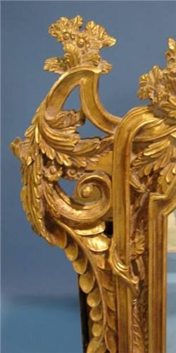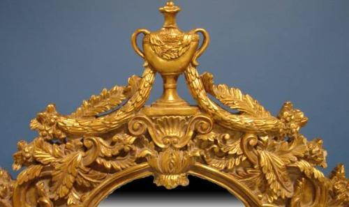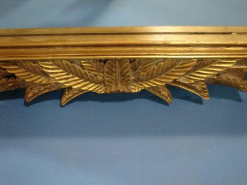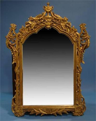 ORNATE CONTEMPORARY GILT WOOD HALL MIRROR. Ornately carved and decorated with urn at top with floral motif. 44.5” x 60.5”