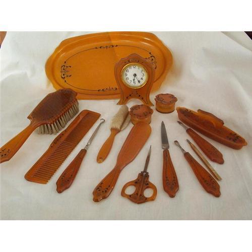 An older 15 piece plastic dresser set. This set has an elegant ornate design on most of the pieces. The pieces include a tray, clock, comb, 2 brushes, 2 covered round boxes, shoe spoon, button hook, cuticle sissors, and several other manicure items.