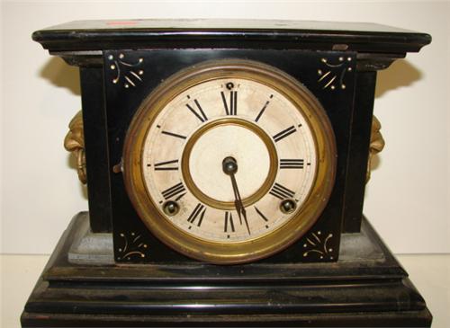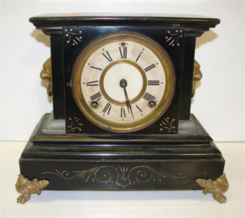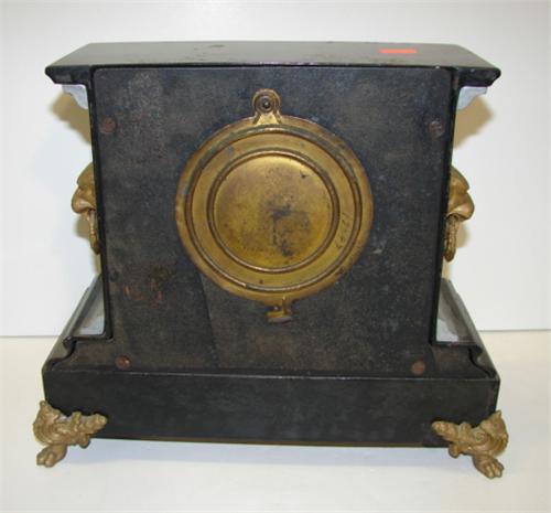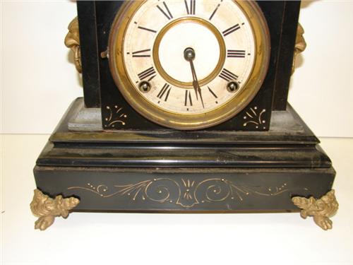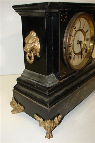 ORNATE EBONIZED MANTEL CLOCK. Ormalu bronze claw feet and lion head decorations at sides. Clock works are marked “Ansonia Clock Co./New York”. 10.25” H