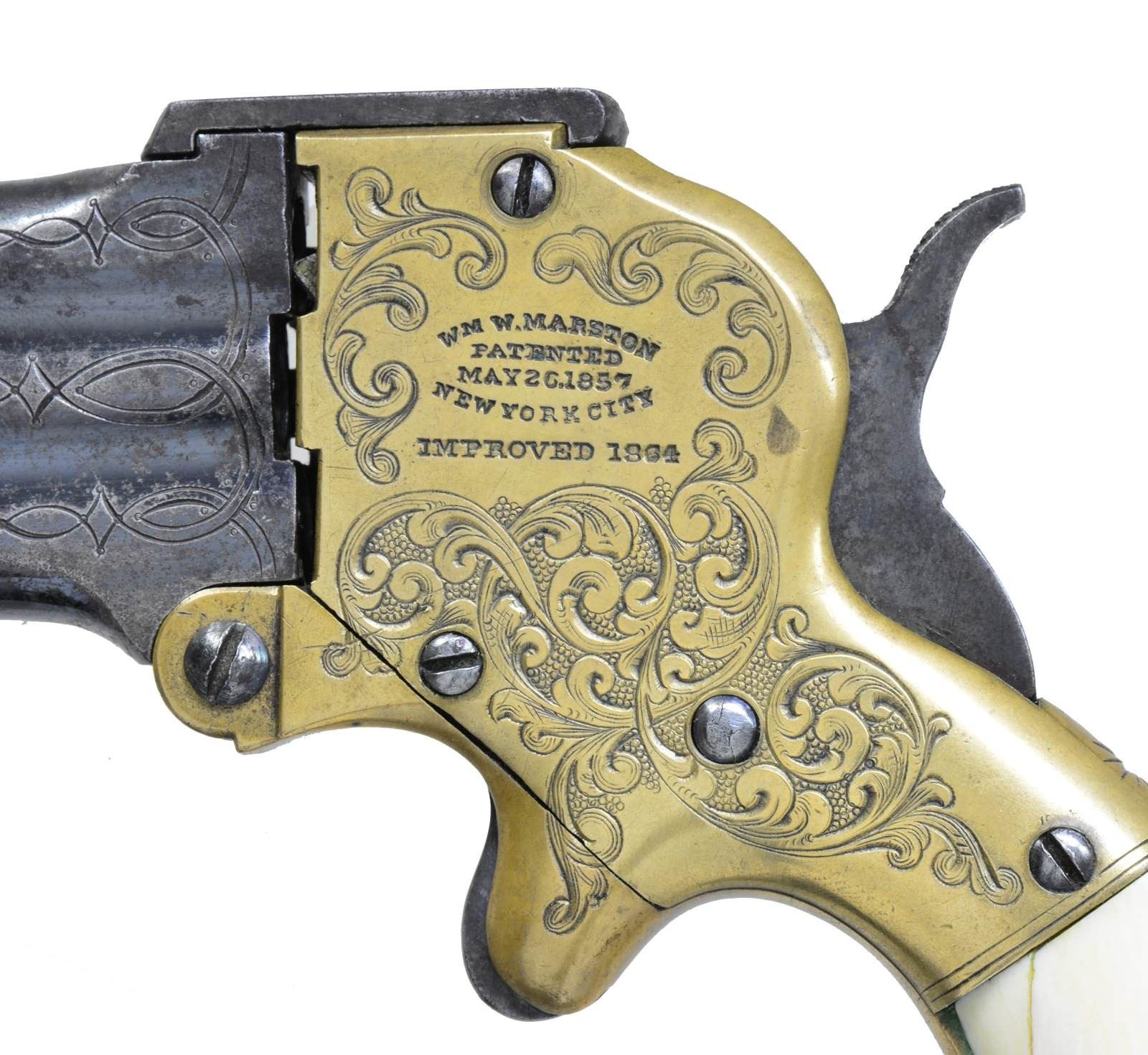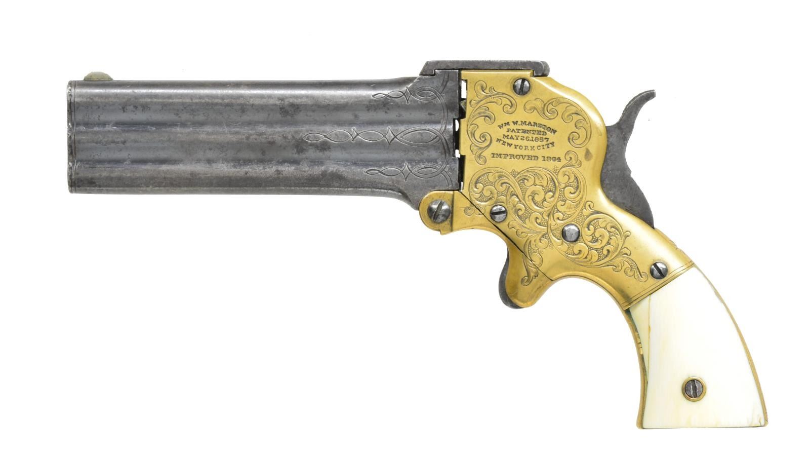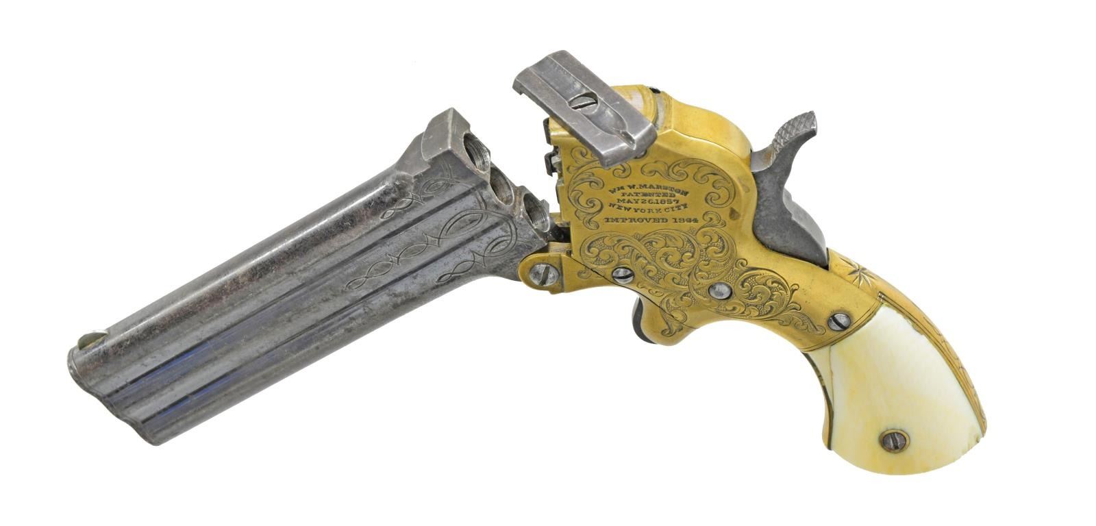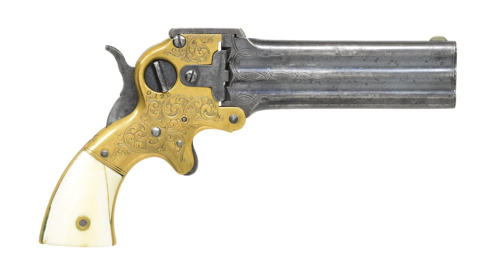 DERRINGER. Cal. 32 RF. S# 17. Bbls. 4" Superposed that pivot downward for loading. Brass frame w/ spur trigger having extractor device & bbl. selector knob on right side. 50% Coverage of vine type foliate scroll factory engraving w/ punch dot backgrounds. Breech end of bbls. have complimenting engraved highlights. 2 Piece ivory grips. Decorative scroll engraving is believed to be standard only on the first 50 pistols. Approx. 3,300 mfg. 1864-1872. CONDITION: bbls. retain over 50% brightly polished blue showing areas of fading & sm. spots of corrosion. Brass frame has a lightly cleaned bright appearance. Both grips have repairs along the grip strap. Crisp mechanics. Bores retain largely intact rifling showing scattered pitting. (01-17961/DS). ANTIQUE. $6,000-9,000.