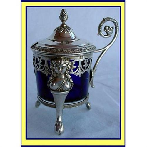 Sterling (.950 ) silver mustard pot with original cobalt glass liner and gilded spoon / ladle, made Paris, France 1809-1819.<BR>Pot is 4 1/2inches high.<BR>Exceptional mustard pot stands on 3 paw feet extending to 3 caryatids or mask head and busts. Delicate openwork seperates them. The handle consists of scrolling acanthus leaves ending in a finely modelled and superbly detailed dog head. Pineapple finial on top of domed, hinged lid.<BR>The pot is fully hallmarked for Paris 1809 -1819 ie it has the Paris guarantee mark for those years, the .950 fineness mark (a rooster in a horizontal octogon) and a lozenge with the maker's mark. These marks are all repeated on the sides with a much enlarged maker's lozenge, featuring a lion with initials S E and B. <BR>The spoon or ladle is richly gold plated .950 silver. It is relatively large and does not originate with the pot. Measures 4 1/2inches in length. Arches from deep bowl to widened end. Hallmarked for Paris 1809-19, small items and maker's mark (a lozenge with crescent and 1).<BR>Original blue glass liner in excellent condition with no chips/cracks.<BR>Condition of all pieces is excellent.