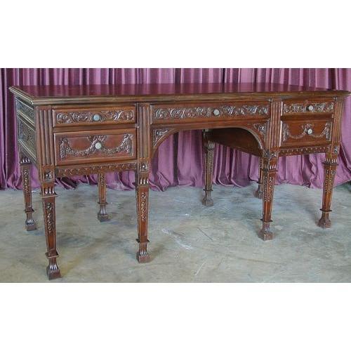 IT DOESN'T GET ANY BETTER THAN THIS PIECE! ORNATE CARVINGS AND VICTORIAN SCROLLING THROUGHOUT! UNBELIEVABLE IN EVERY WAY! FIVE DOVETAILED DRAWERS TO THE FRONT AND THE BACK IS AS ELEGANTLY CARVED SO THAT THE DESK CAN SIT IN THE MIDDLE OF YOUR OFFICE OR PARLOR. DON'T MISS OUT ON THE FABULOUS PIECE!