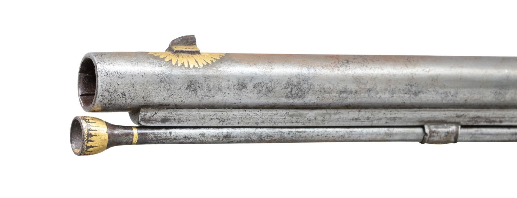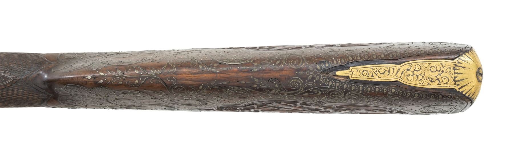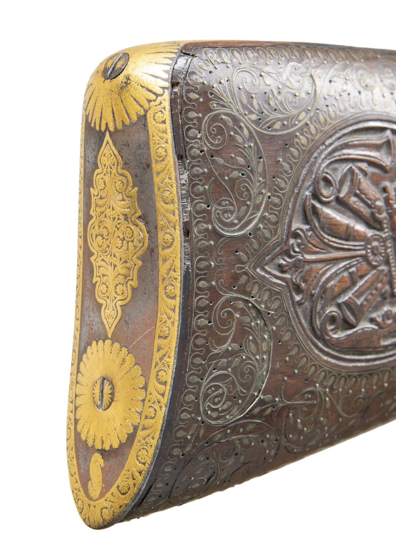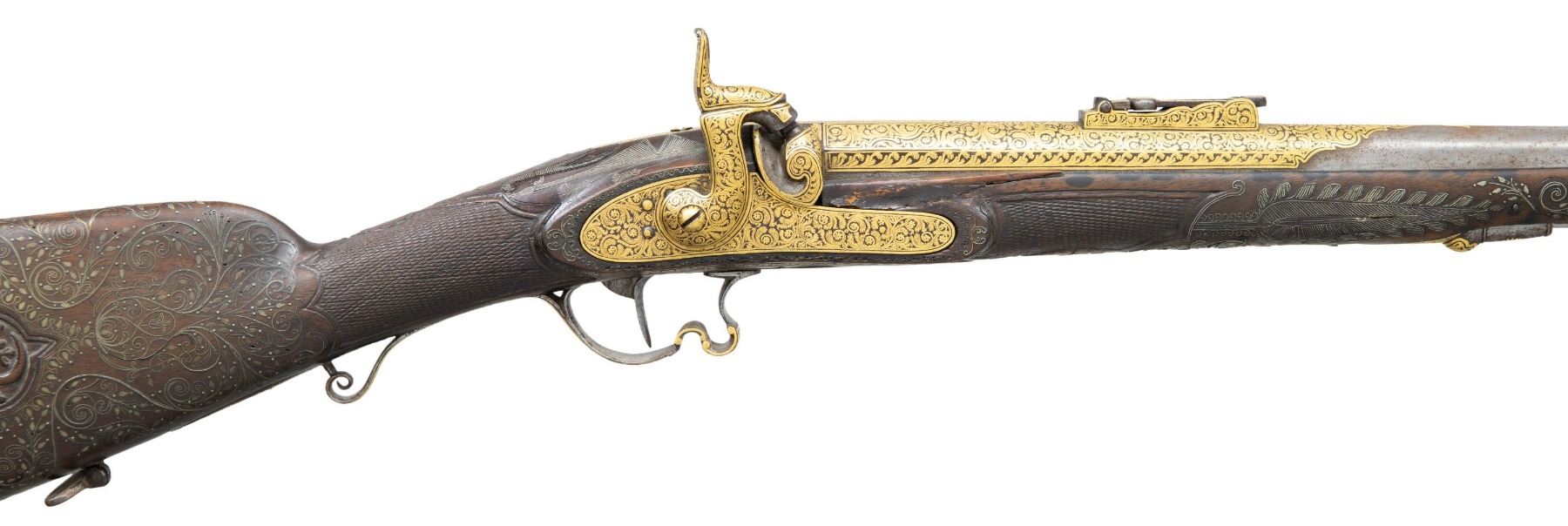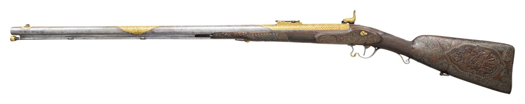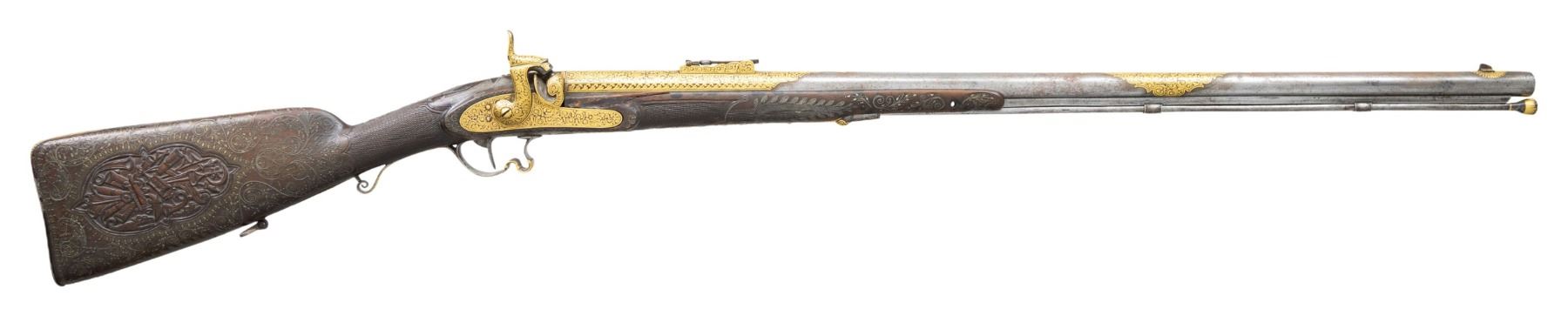 SPORTING RIFLE. Cal. 58. NSN. 45" overall, 30" octagonal to round barrel lavishly gold inset engraved, Enfield long range rear sight. Enfield style lock and hammer heavily gold inset & engraved. Sculpted steel trigger guard, butt plate, and ramrod thimble & pipes are gold inset engraved en suite to lock & barrel. Stock is beautifully carved with large panoplies of arms and figural silver wire inset. UNATTACHED ACCESSORIES: collection notes. CONDITION: very good overall, inset wood repair above lock, 1.5" chip missing from nose on left side, missing front sling swivel, gold insets fine, several silver wire inset tendrils have risen but wire has few small reductions. Mechanics fine, crisp rifled bore. PROVENANCE: Estate Collection of Dr. Curtis S. Morse. (01-26302/JS). ANTIQUE. $2,000-4,000.