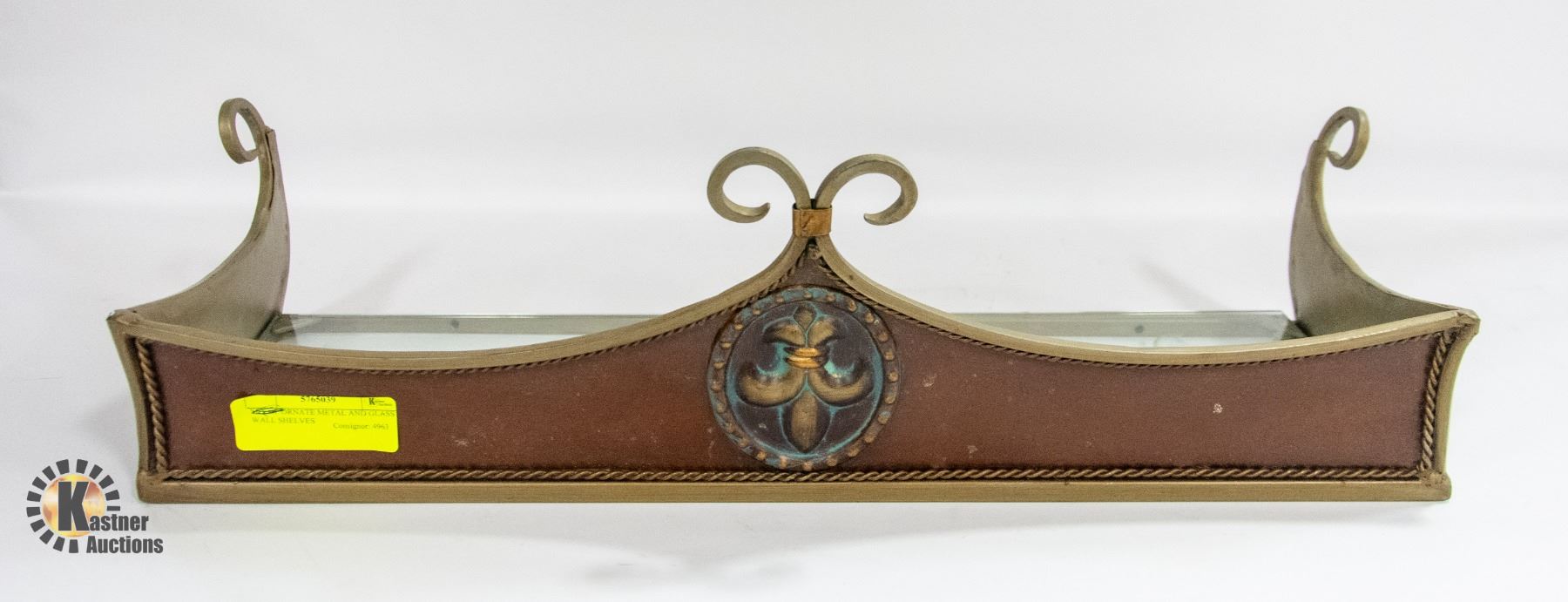 ORNATE METAL AND GLASS WALL SHELF