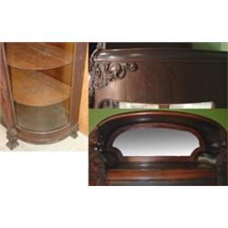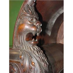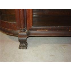 ORNATE OAK CHINA CLOSET. Griffin decoration on mirrored bonnet top. Closet has mirrored back. Claw feet & columns. Curved glass on sides. Three shelves. Missing molding on top left measuring 9". Loss of veneer on top right measuring 4.25". Small amount of veneer is missing on bottom of door. 77.5" H, 54" W, 18" D