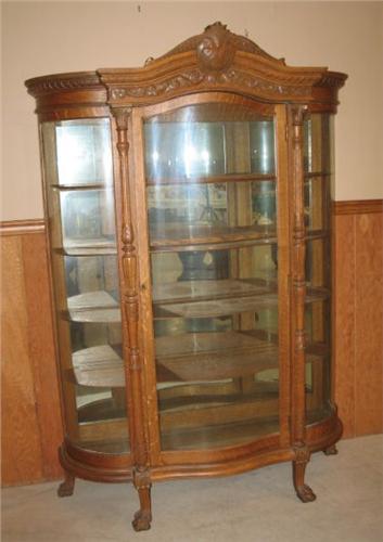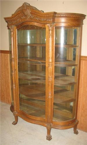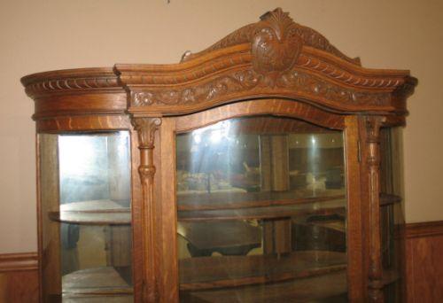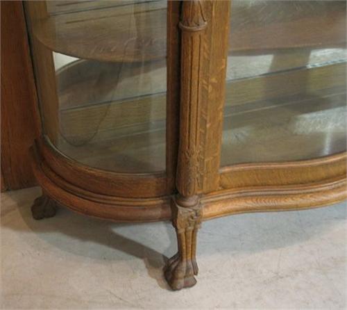 MASSIVE ORNATE OAK CHINA CLOSET. Curved glass at sides & serpentine glass door at front. Ornately carved decoration at top. Rests on claw feet. Carved columns at both sides of front door. Mirrored back with four wooden shelves. 78.5” H, 51” W, 15” D