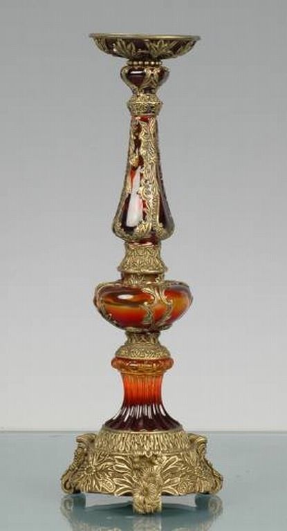 ORNATE POLY RESIN CANDLEHOLDER - BRUSED WITH GOLD - 5.2L" x 5.2W" x 15.3H"