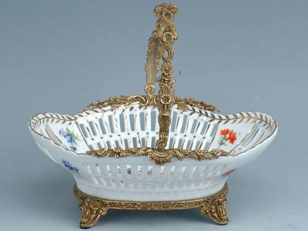 ORNATE PORCELAIN FRUIT BOWL - HAND PAINTED FLORAL DESIGN TRIMMED WITH GOLD - VERY INTRICATE CUT WORK - BRASS HANDLE AND BASE - 9L" X 7W" X 4.3H"