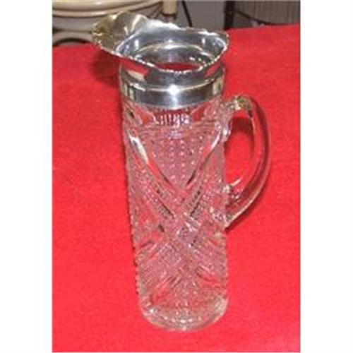 This is a beautiful early pressed glass tankard with a fancy trimmed silver plate lip. I am saying silver plate because it isn't marked anywhere that I can find but it is not worn anywhere. It has a very ornate design pressed into the glass with a handblown and hand applied handle. It is 11" high and the base is 3 1/4" round. It is in excellent condition but has a small flake on the very bottom (Does not come up to the top edge) which almost feels more like a rough area, but I'm going to call it a flake. This would be from the late 1800s to the early 1900s at least.