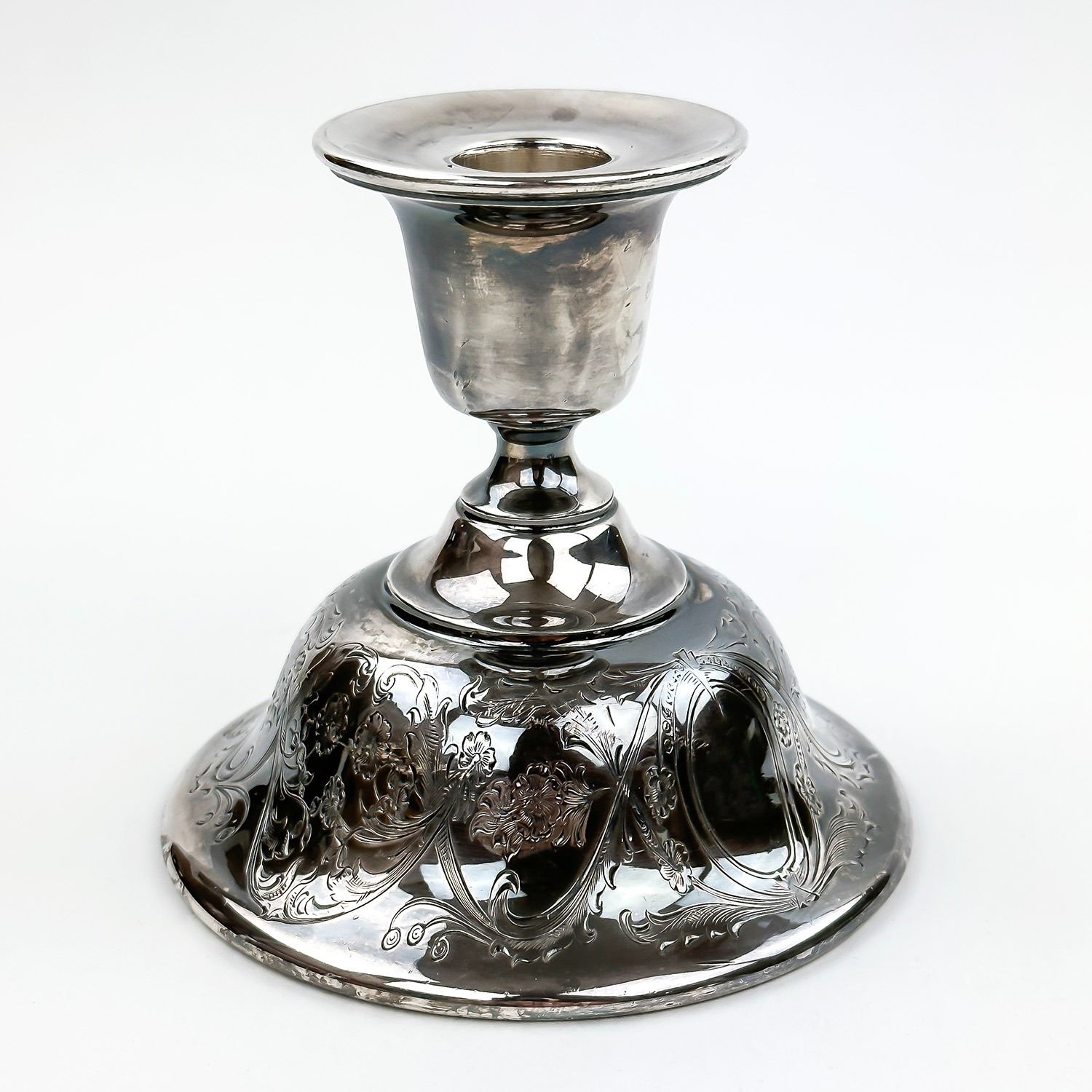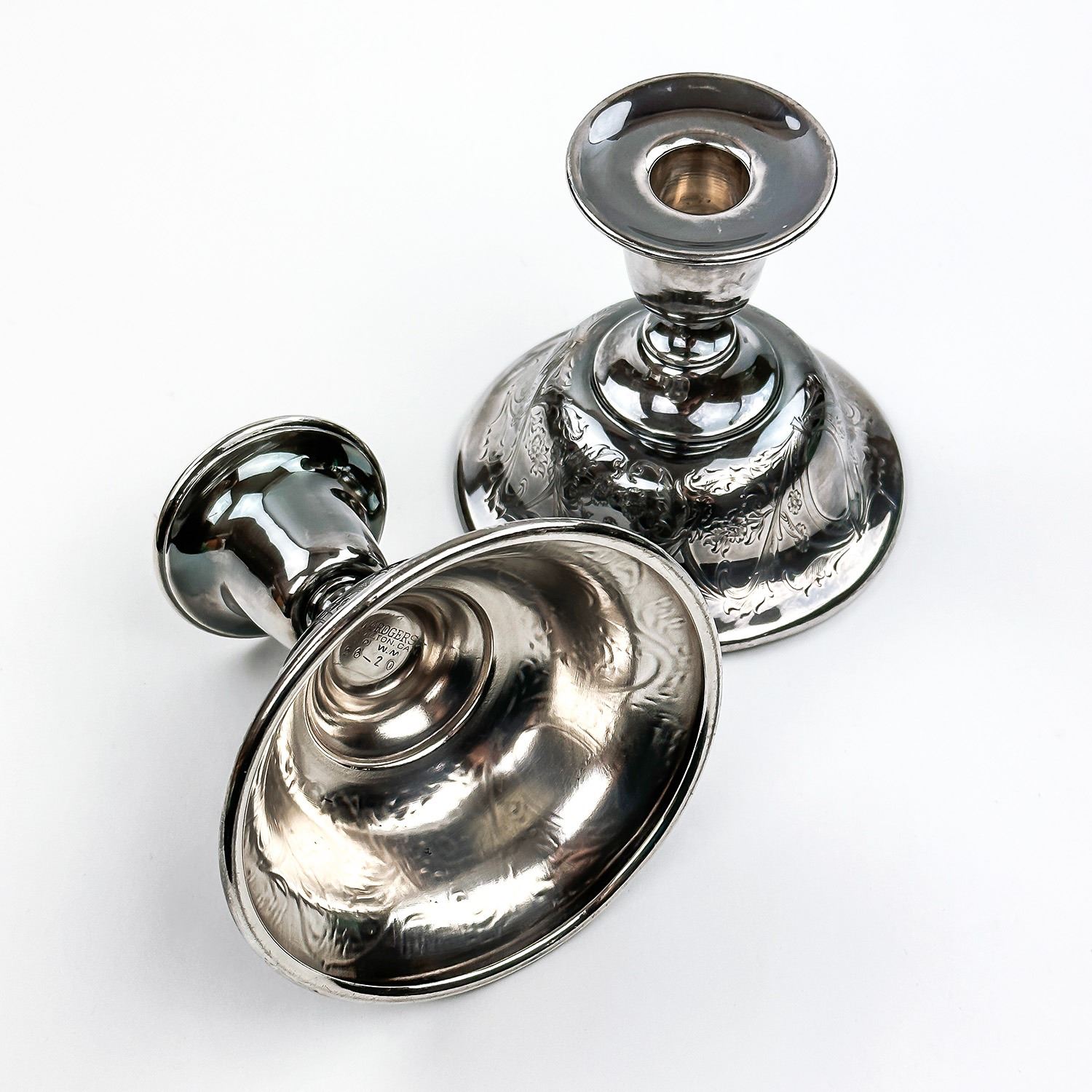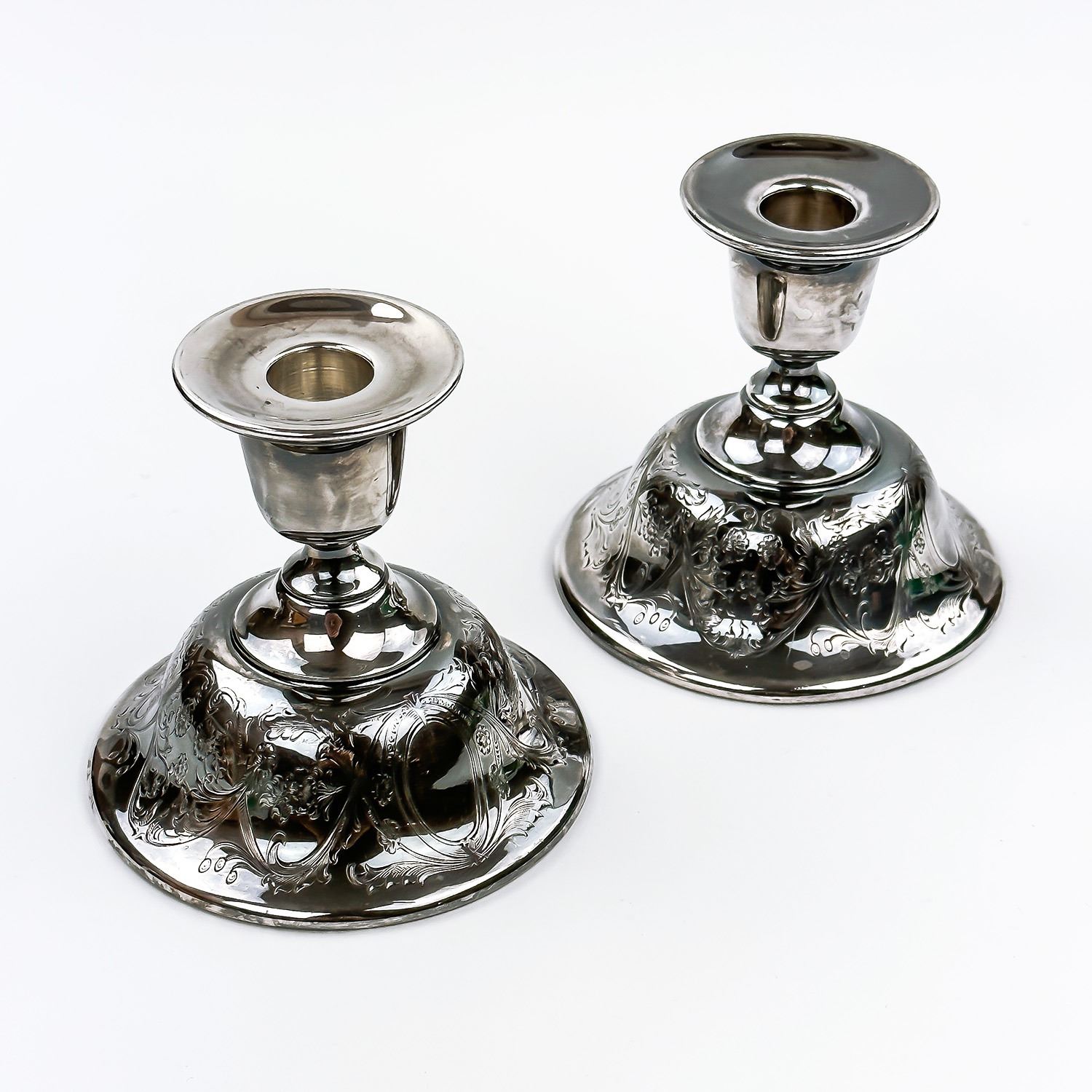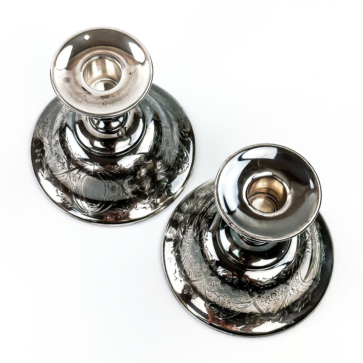 #8876 - ORNATE FLORAL ETCHED CANDLE HOLDER SET BY WM ROGERS - HAMILTON, ONTARIO, CANADA. THEY MEASURE: 4” (10 CM) TALL BY 4.25” (10.75 CM) BASE DIAMETER***ITEM(S) LOCATED IN LETHBRIDGE ALBERTA. FREE TRANSPORT TO EDMONTON OFFICE AVAILABLE FOR THIS AUCTION. WORLDWIDE SHIPPING IS AVAILABLE FOR ALL ITEMS