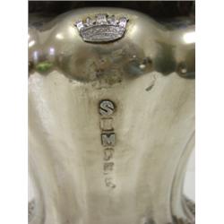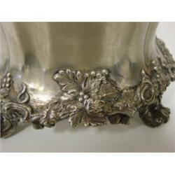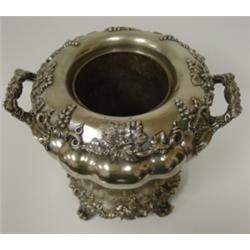Ornate silverplate wine cooler with double handles, ornately decorated feet. Has silverplate insert. Has applied crest and applied SEMPRE on body. In need of cleaning. 10.5" H