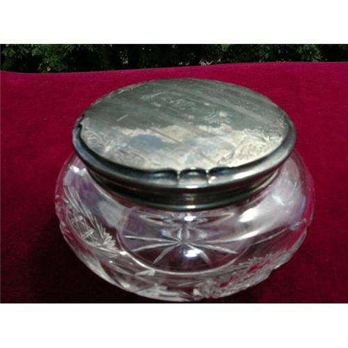 THIS POWDER/DRESSER JAR IS PRESSED GLASS - 8 STAR SHAPED CUT & HAS A STERLING 925 COVER MARKED. IT IS 2" (5CM) HEIGHT, 4.5" (11.5CM) WIDEST AND IT IS IN GOOD CONDITION. WILL POST MORE PICTURES.