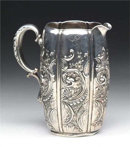 ORNATE STERLING SILVER PITCHER BY WHITING MFG. CO. Bottom marked “2 Pints” with No. “3091”. Paneled side has repose scroll design. Monogrammed MM and WE 1890”. WEIGHT: 14 tr. oz. SIZE: 6-3/4” h. CONDITION: Some dents to base rim, otherwise very good. 9-27545
