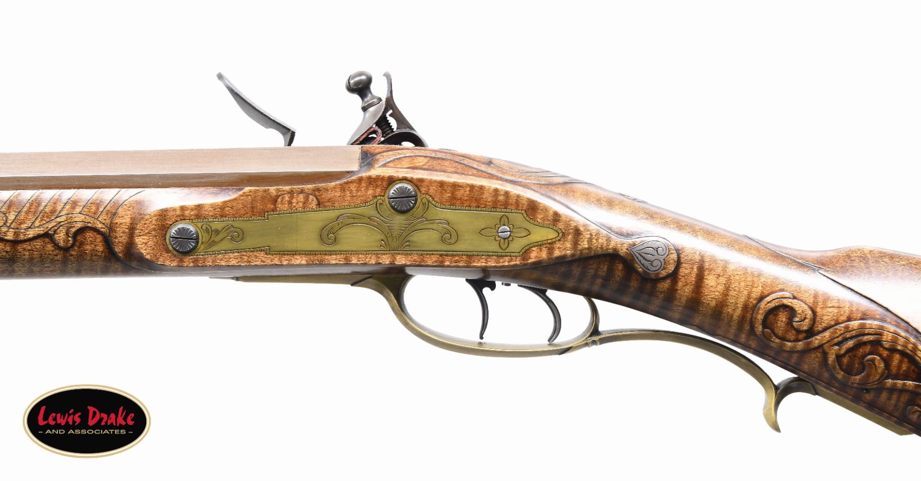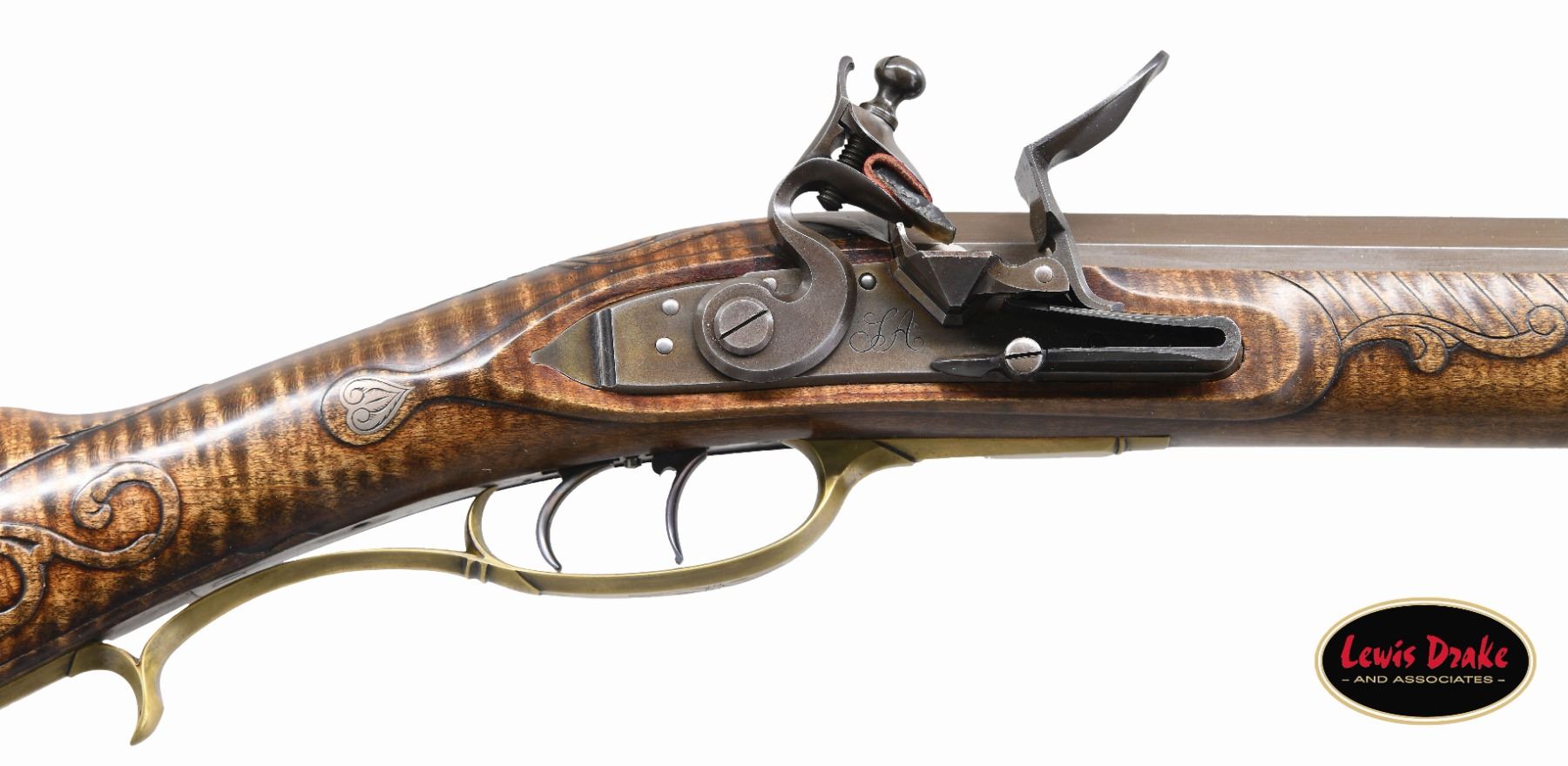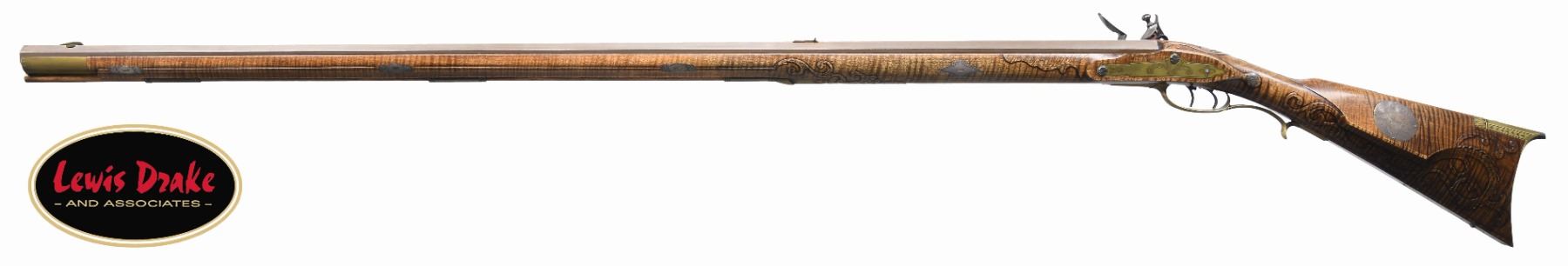 FLINTLOCK RIFLE. Cal. 54. NSN. Bbl. 42" octagon measuring 7/8" across flats at muzzle. German silver blade rocky mountain front sight w/ fixed rear sight having a fine V notch. Top flat has an inlayed brass plate engraved "Alexander". Lockplate is engraved "SA". Stephen Alexander of Tucson, Arizona was a prolific & highly skilled gunsmith who built & restored high-end muzzle loading rifles. Steven passed on July 31st, 2023 at age 70. Double set triggers. Full length curly maple stock held by four brass keys. Brass fittings include a pierced segmented rectangular lid patch box, crescent buttplate, finger curl trigger guard, sideplate & nose cap. Fittings have floral & geometric hand engraving. Cheekpiece has a German silver oval plate engraved w/ an American eagle under thirteen stars. Other German silver fittings include wedge escutcheons w/ the rear escutcheon being 8-pointed stars. Tear drop points behind lock & sideplate have engraved German silver hearts. Areas around cheekpiece, wrist, top tang, lockplate, sideplate & thimble have ornate foliate relief carving. Ramrod channel is highlighted by incise carving. Hardwood ramrod is held by an engraved faceted brass thimble & 2 faceted brass pipes. WEIGHT: 8 lbs, 5 oz. CONDITION: metal has a pleasing light browned finish. Stock has very good finish. Sound lock & trigger. Bright near excellent bore. PROVENANCE: from the renowned collection of quality sporting arms from Lewis Drake together with inventory of Lewis Drake Associates. (01-26126/DS). ANTIQUE. $4,000-6,000.